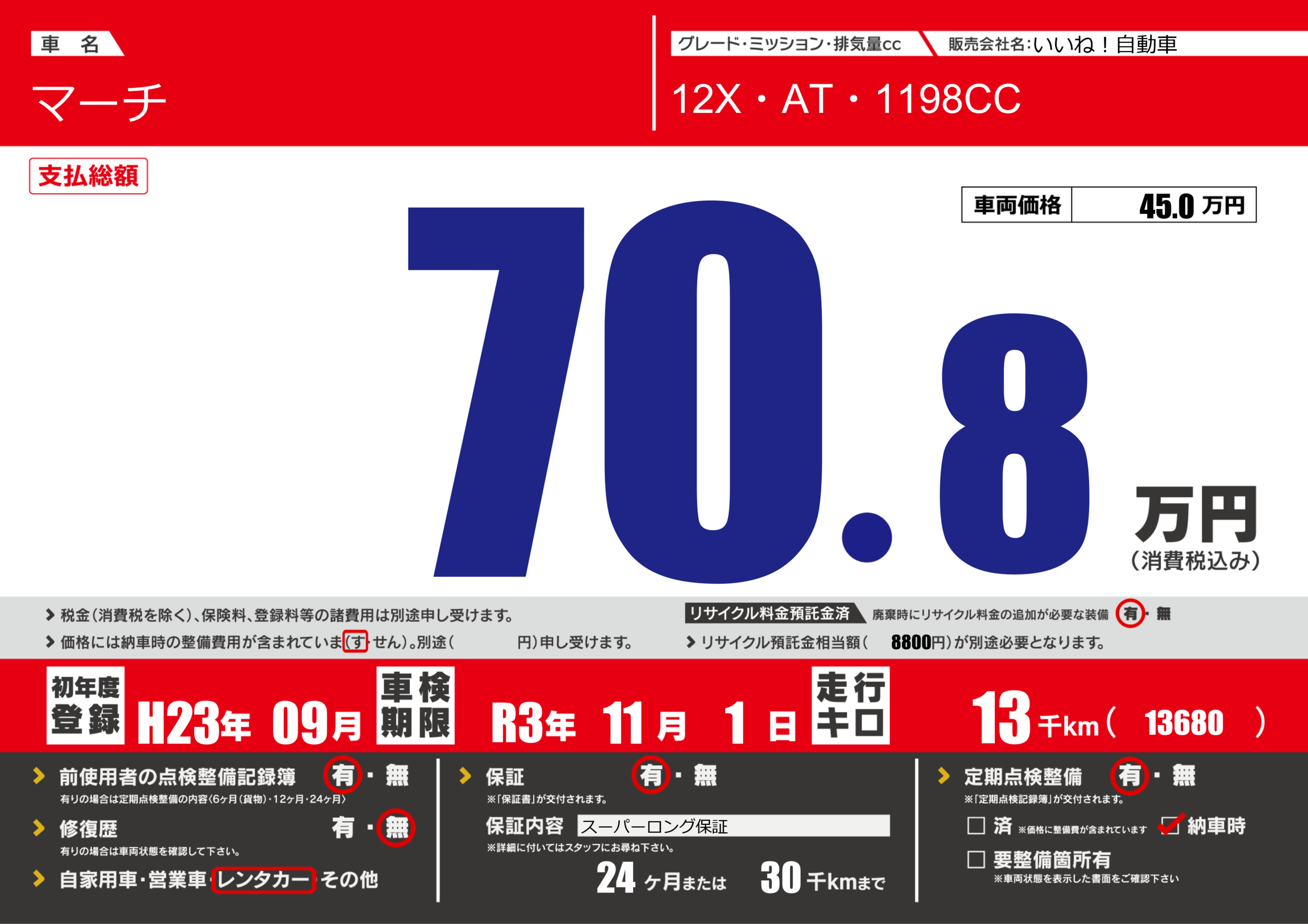| 車名 | マーチ | グレード ミッション 排気量 |