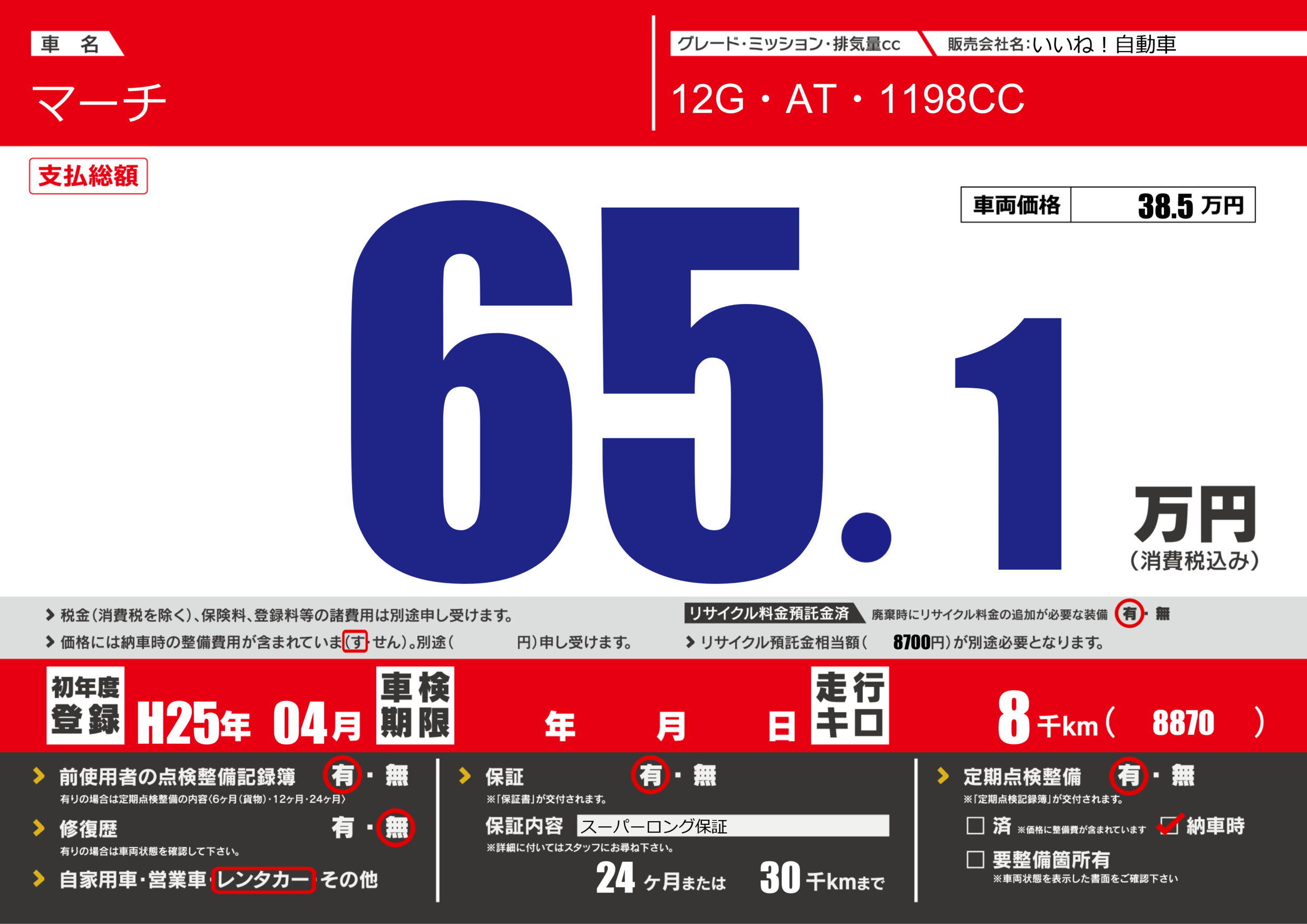 | 車名 | マーチ | グレード ミッション 排気量 |