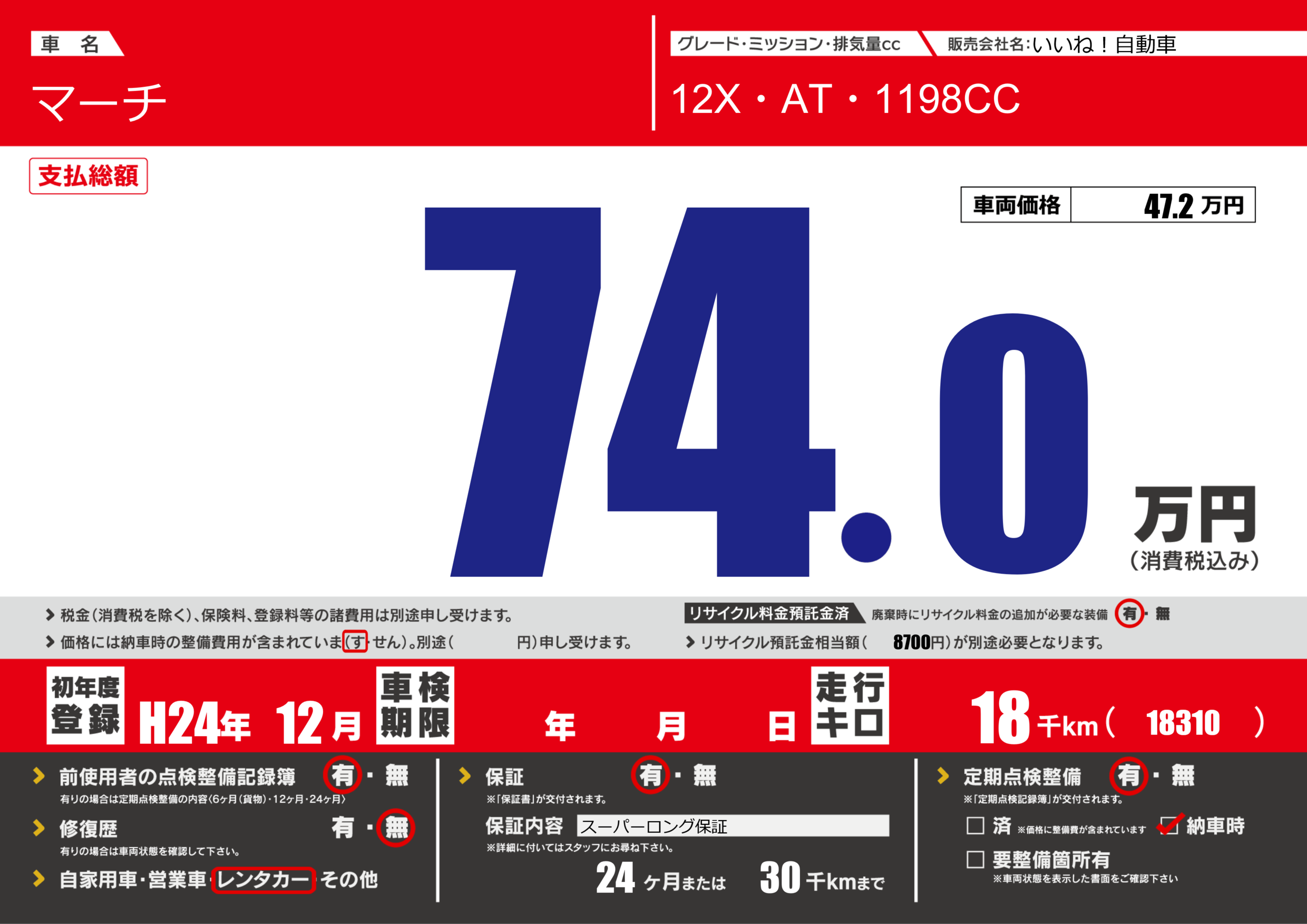 | 車名 | マーチ | グレード ミッション 排気量 |