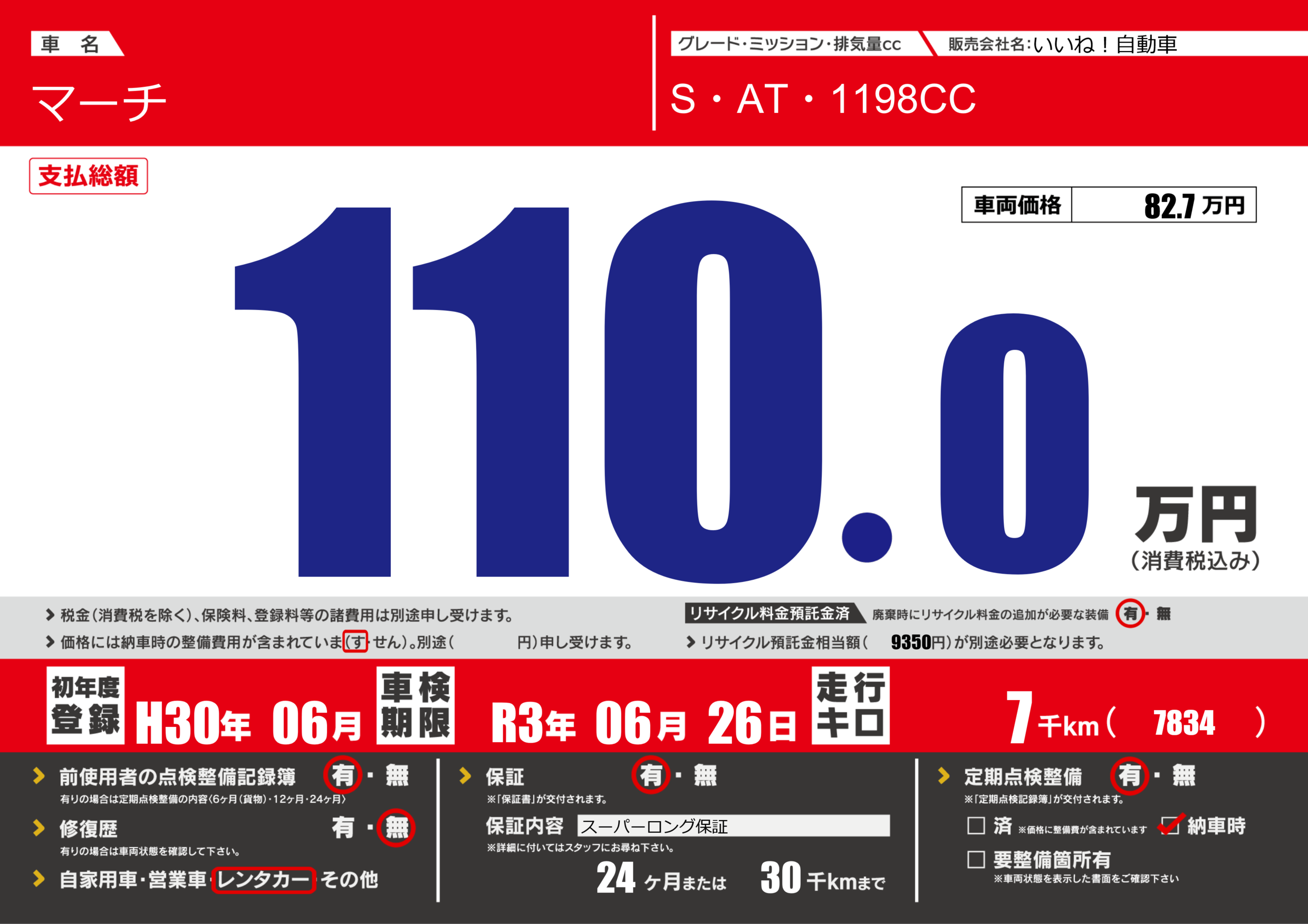 保証付き 保証内容(スーパーロング保証) 24ヶ月または(30)千kmまで |