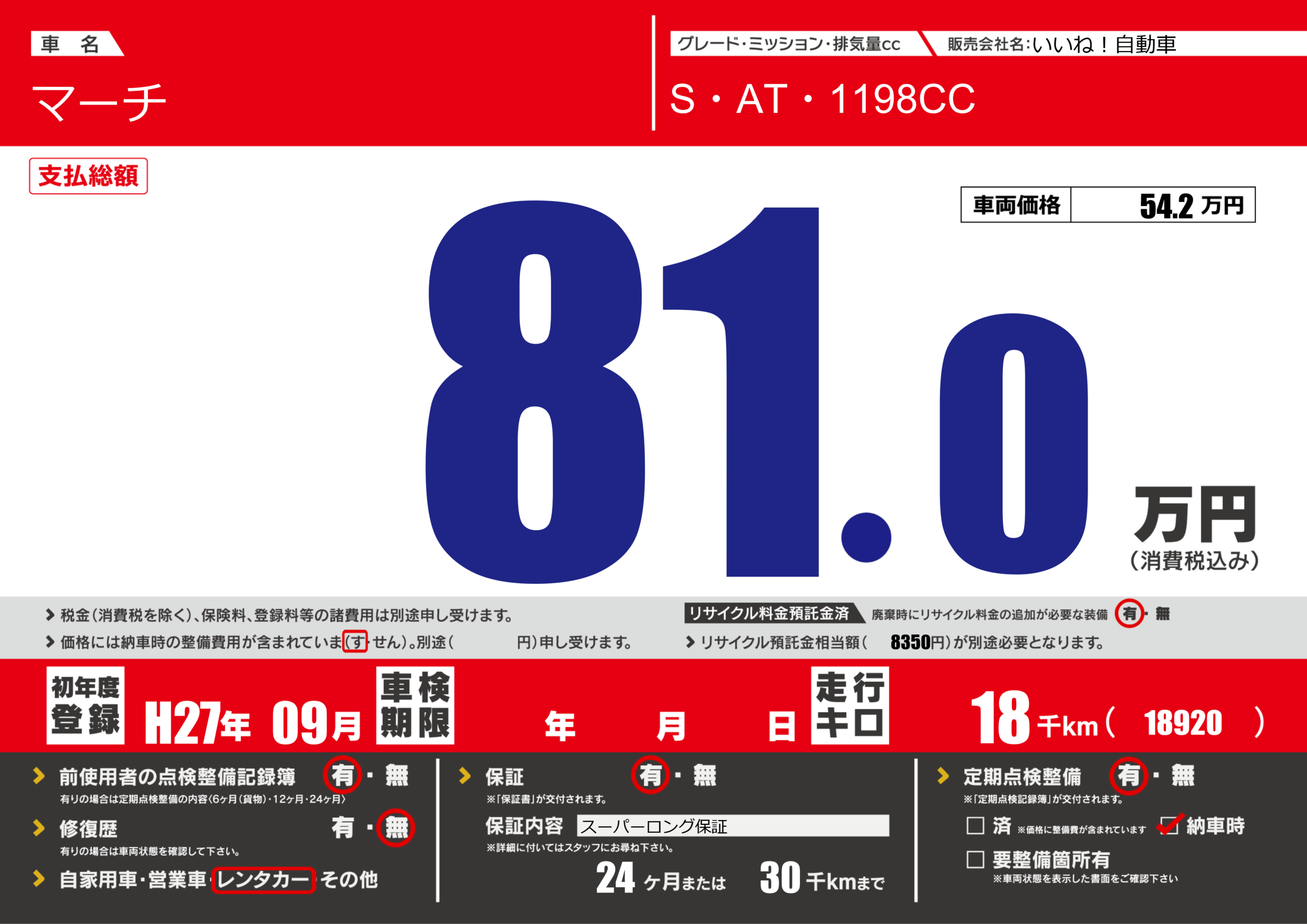 保証付き 保証内容(スーパーロング保証) 24ヶ月または(30)千kmまで |