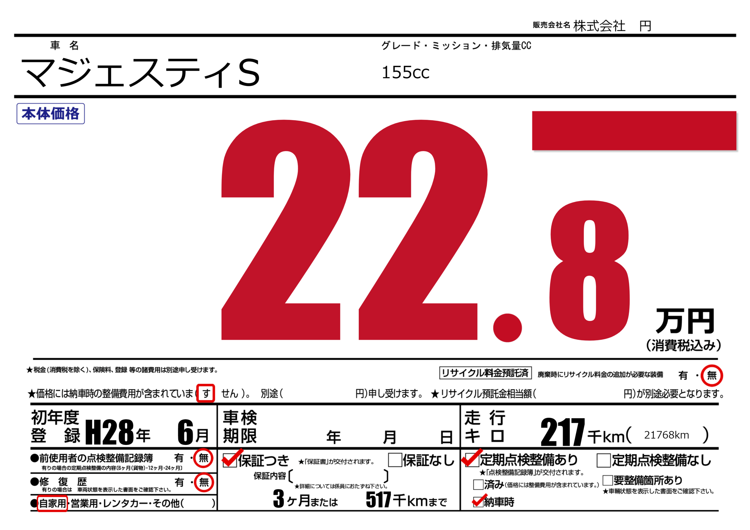 | 車名 | マジェスティS | グレード ミッション 排気量 |
