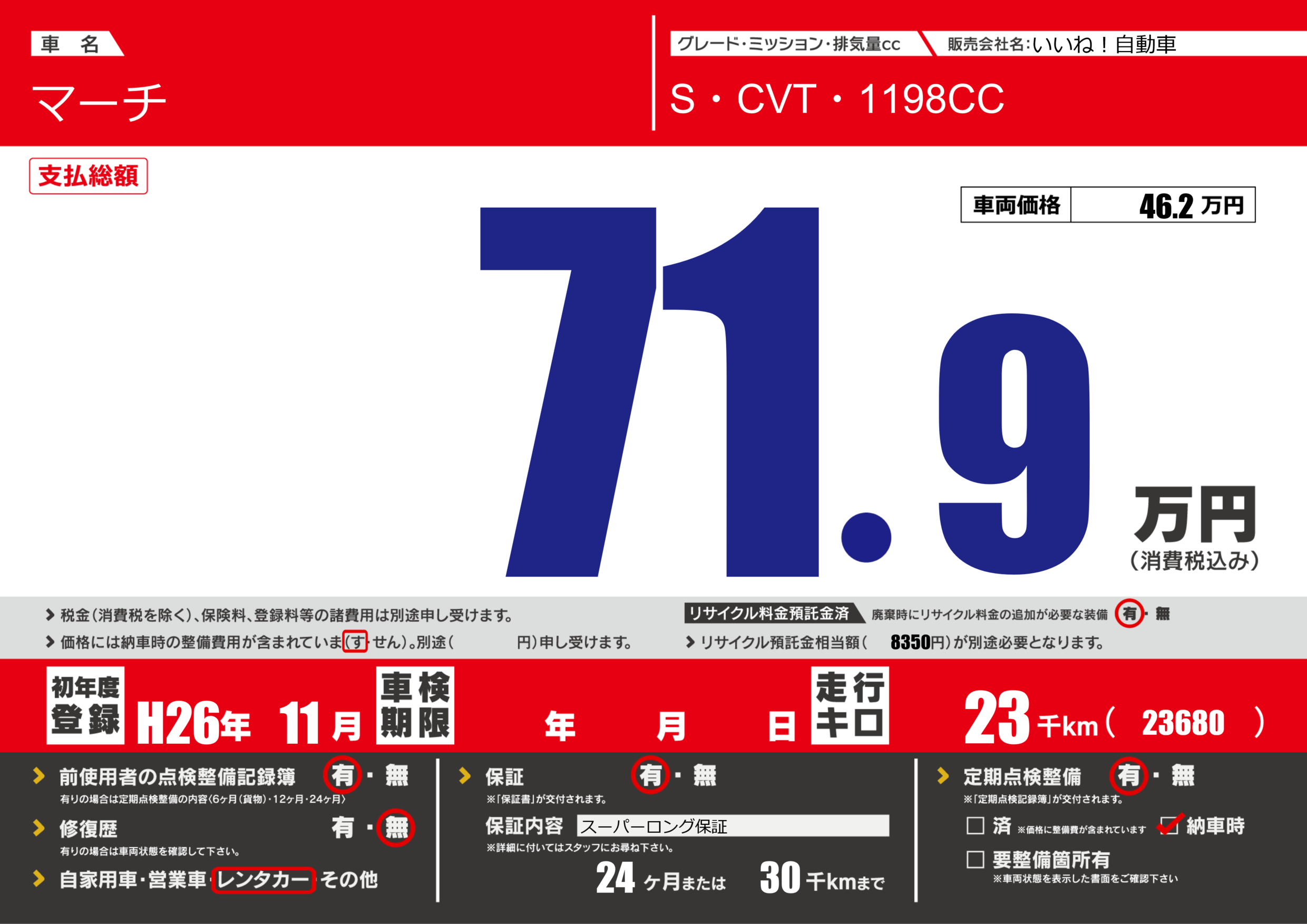 保証付き 保証内容(スーパーロング保証) 24ヶ月または(30)千kmまで |