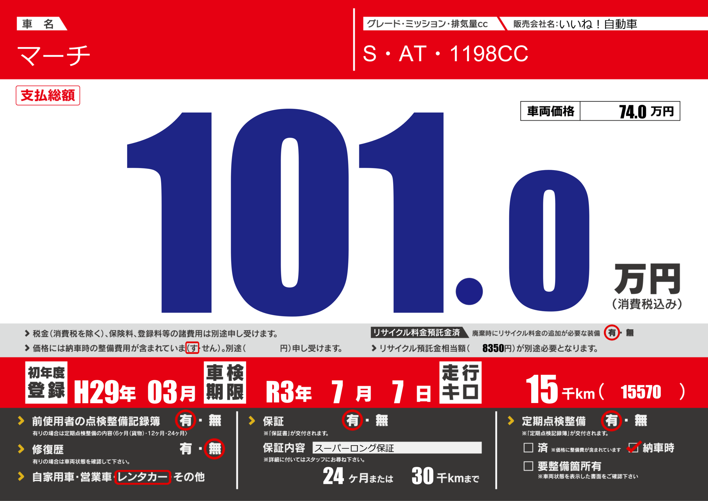 保証付き 保証内容(スーパーロング保証) 24ヶ月または(30)千kmまで |