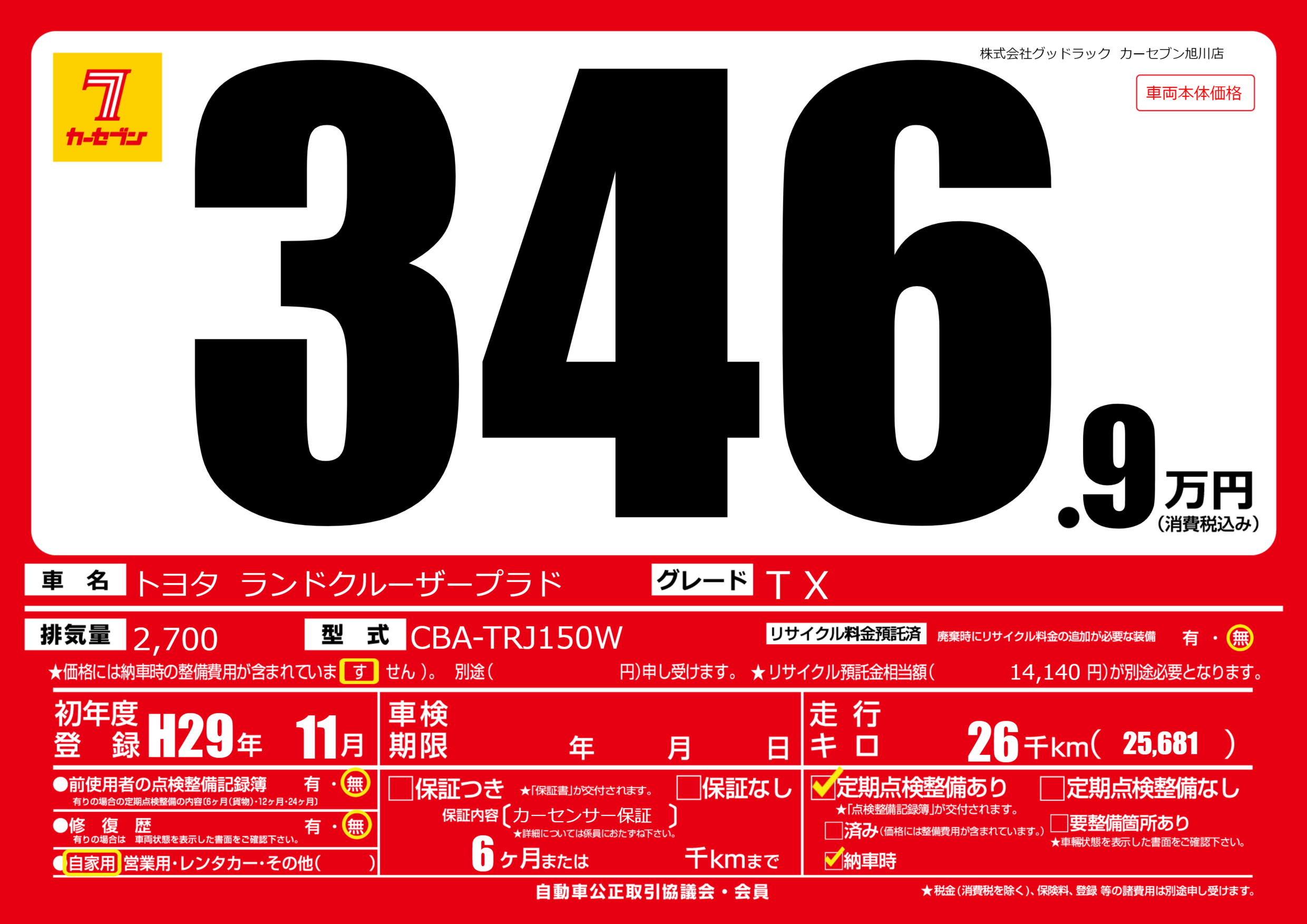 | 車名 | トヨタ ランドクルーザープラド | グレード ミッション 排気量 |