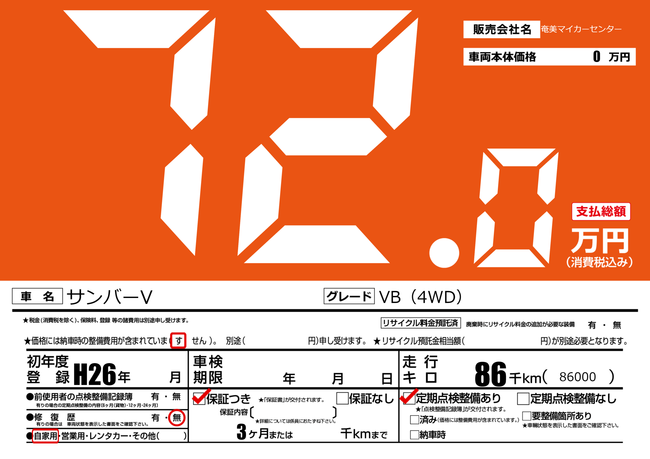 | 車名 | サンバーV | グレード ミッション 排気量 |