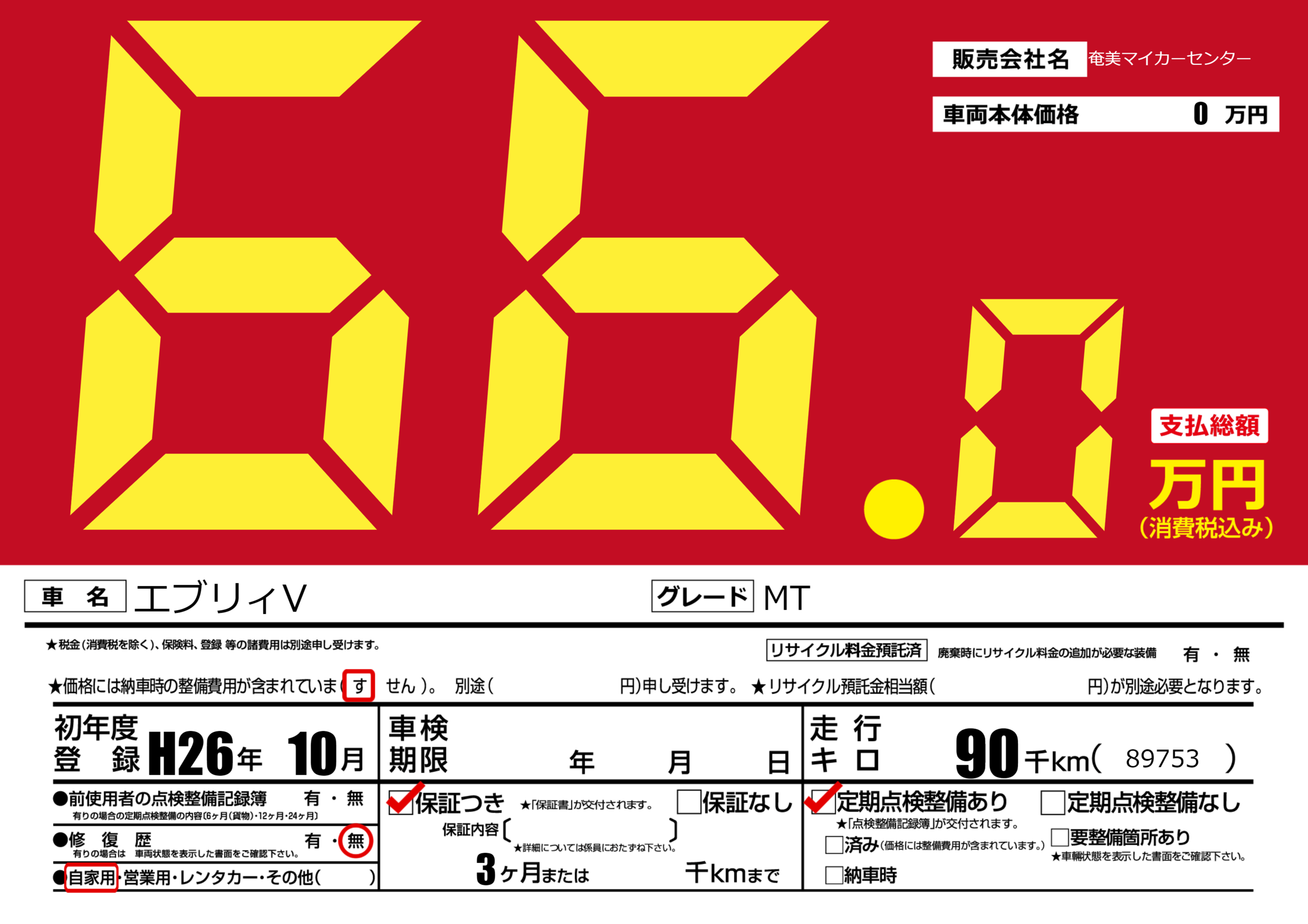 | 車名 | エブリィV | グレード ミッション 排気量 |