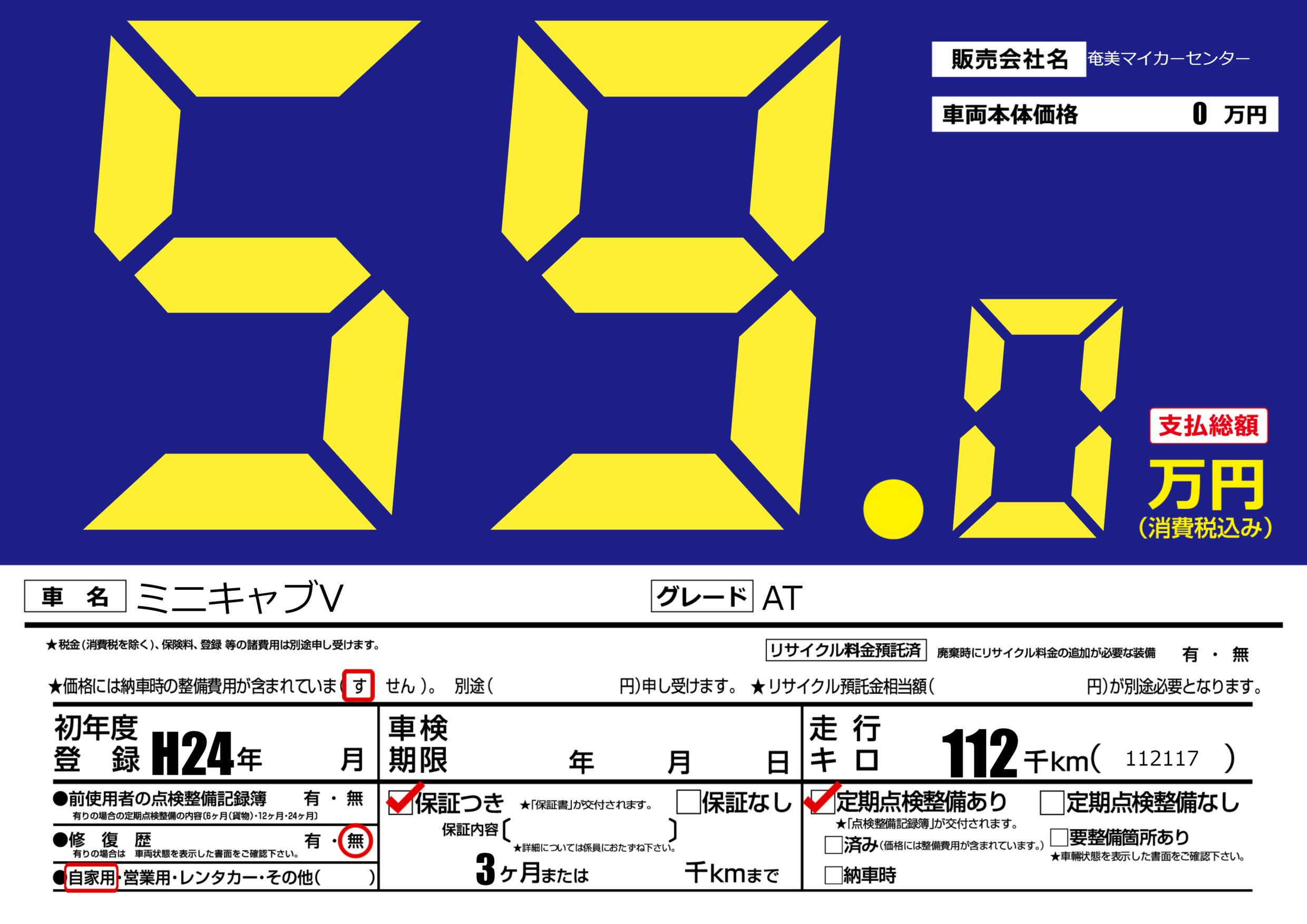| 車名 | ミニキャブV | グレード ミッション 排気量 |