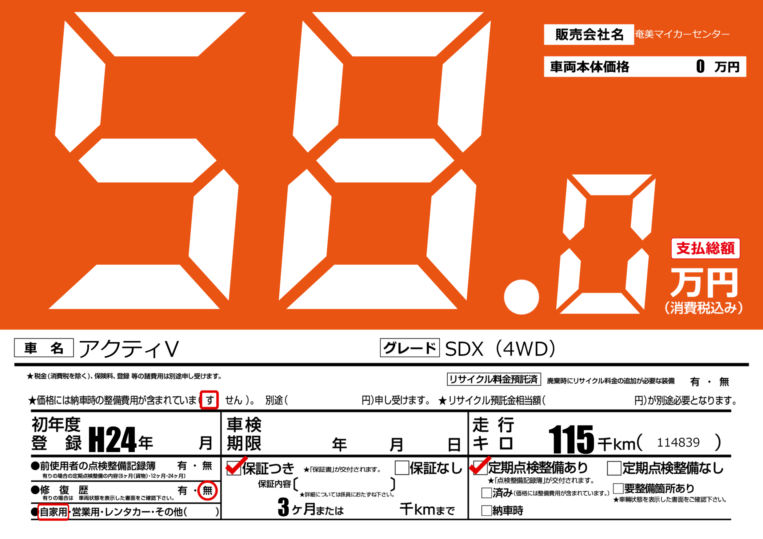 | 車名 | アクティV | グレード ミッション 排気量 |