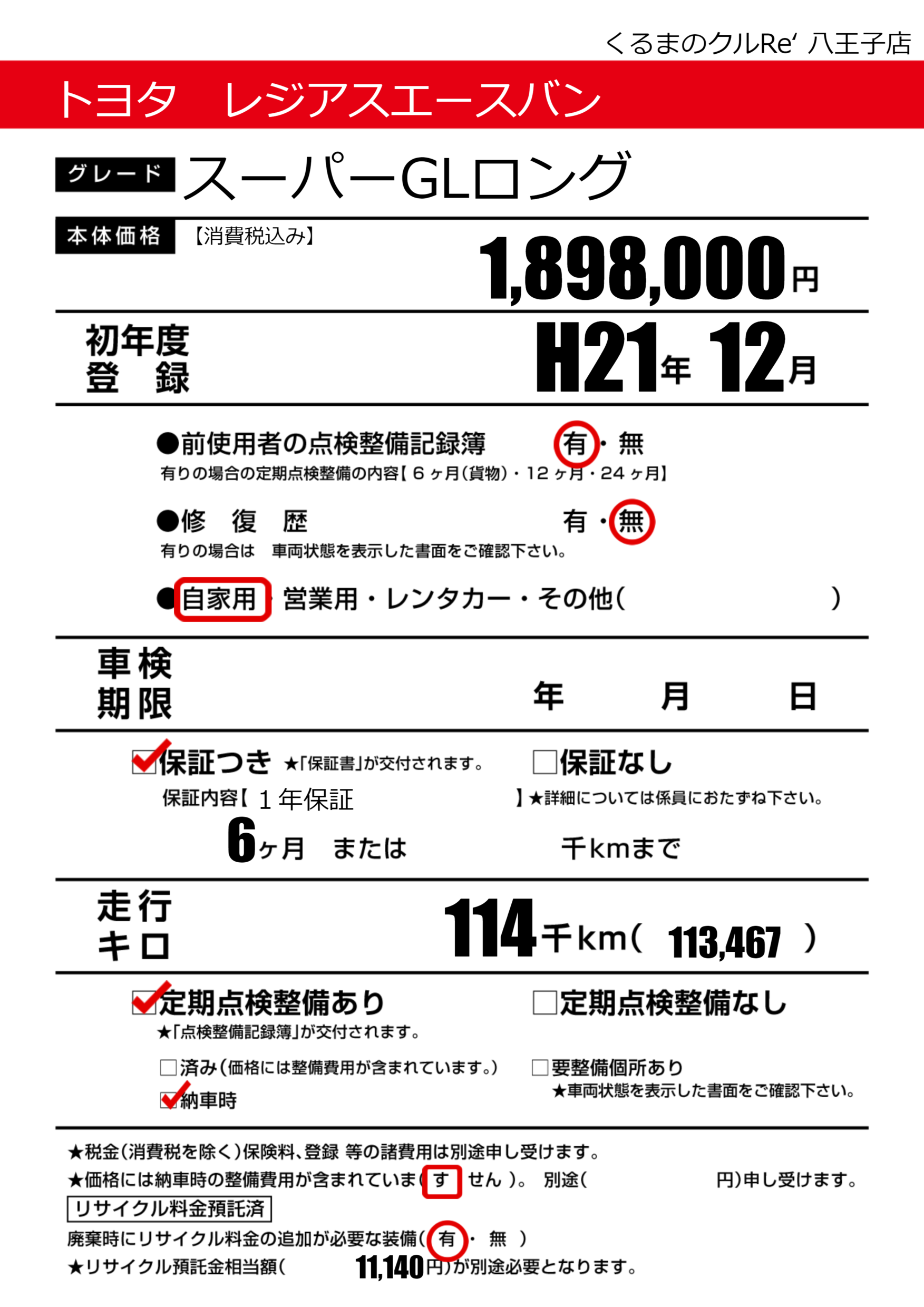 | 走行キロ | 11.4万km | 初年度登録 | H21年12月 |