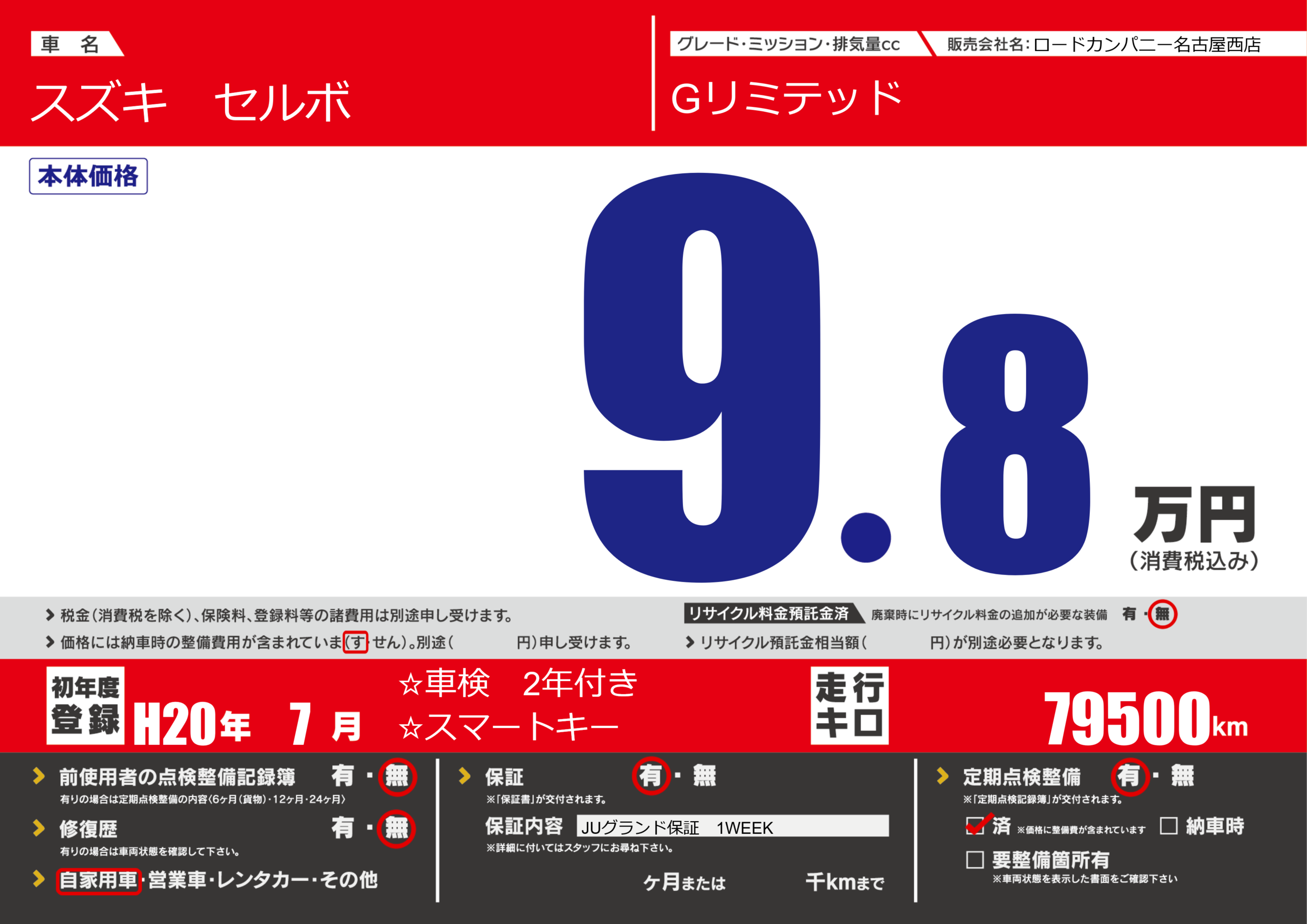 | 定期点検整備 | 定期点検整備あり 定期点検整備済み | ||