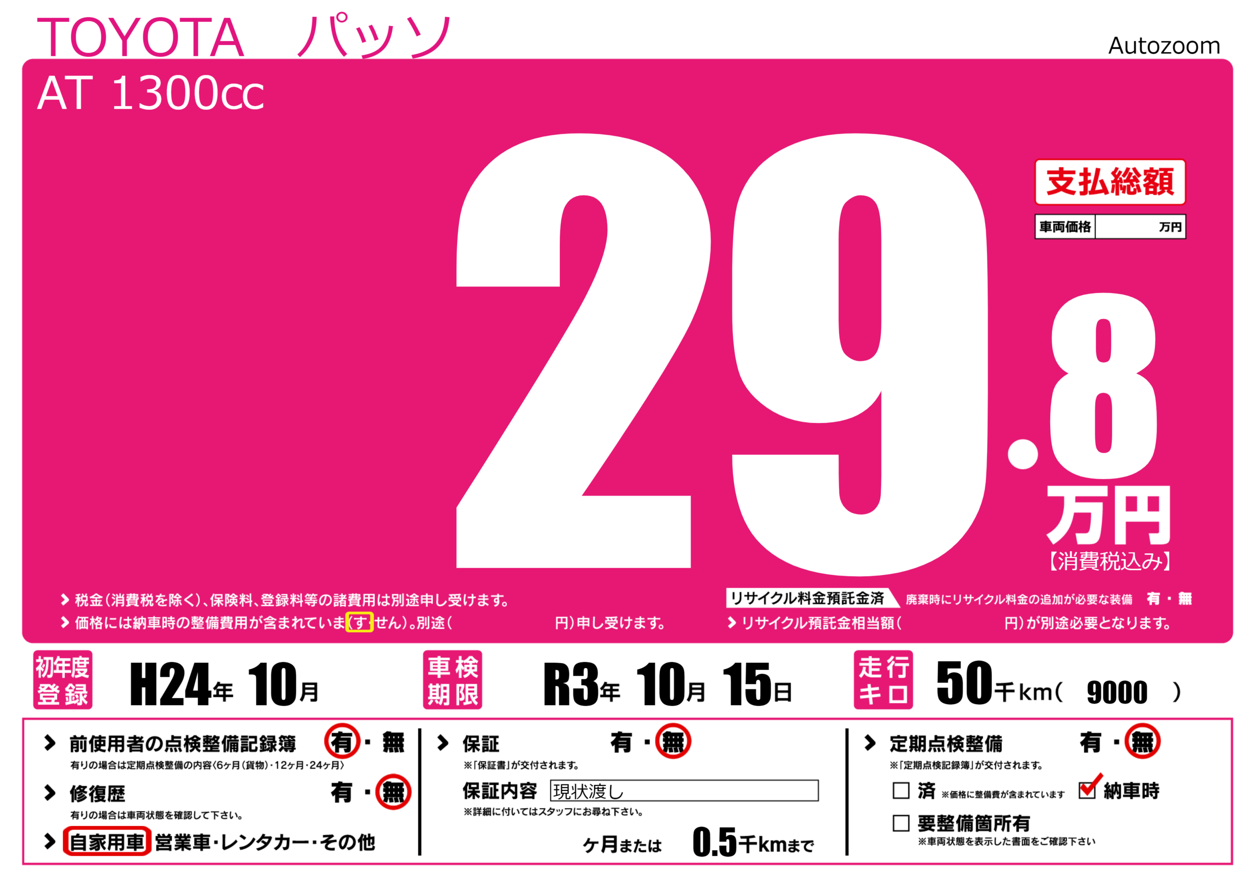 | 車名 | TOYOTA パッソ | グレード ミッション 排気量 |