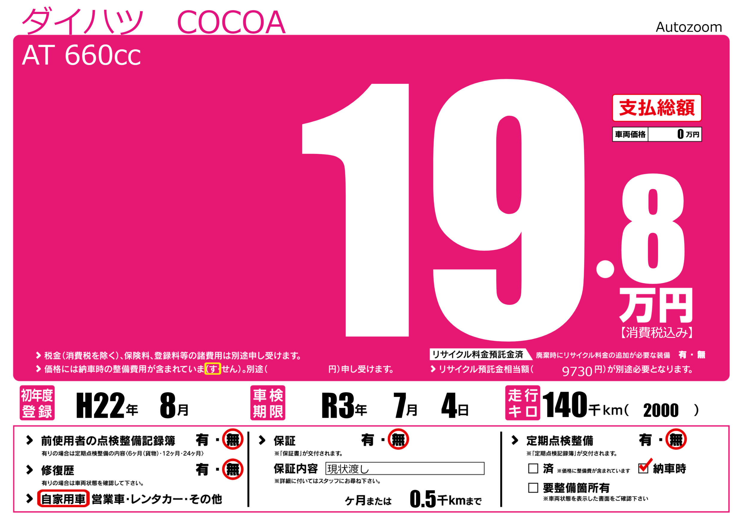 | 車名 | ダイハツ COCOA | グレード ミッション 排気量 |