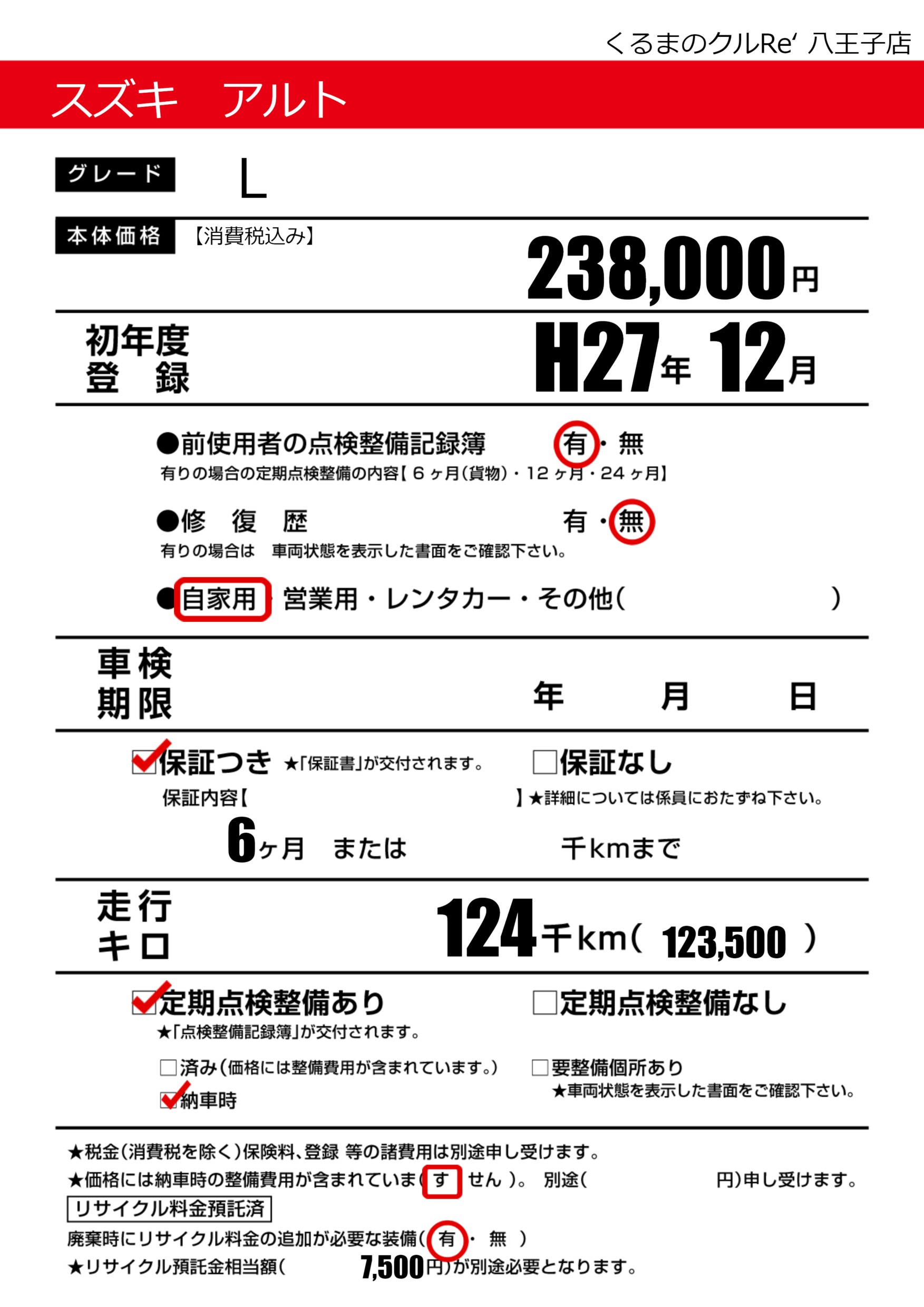 | 車名 | スズキ アルト | グレード ミッション 排気量 |