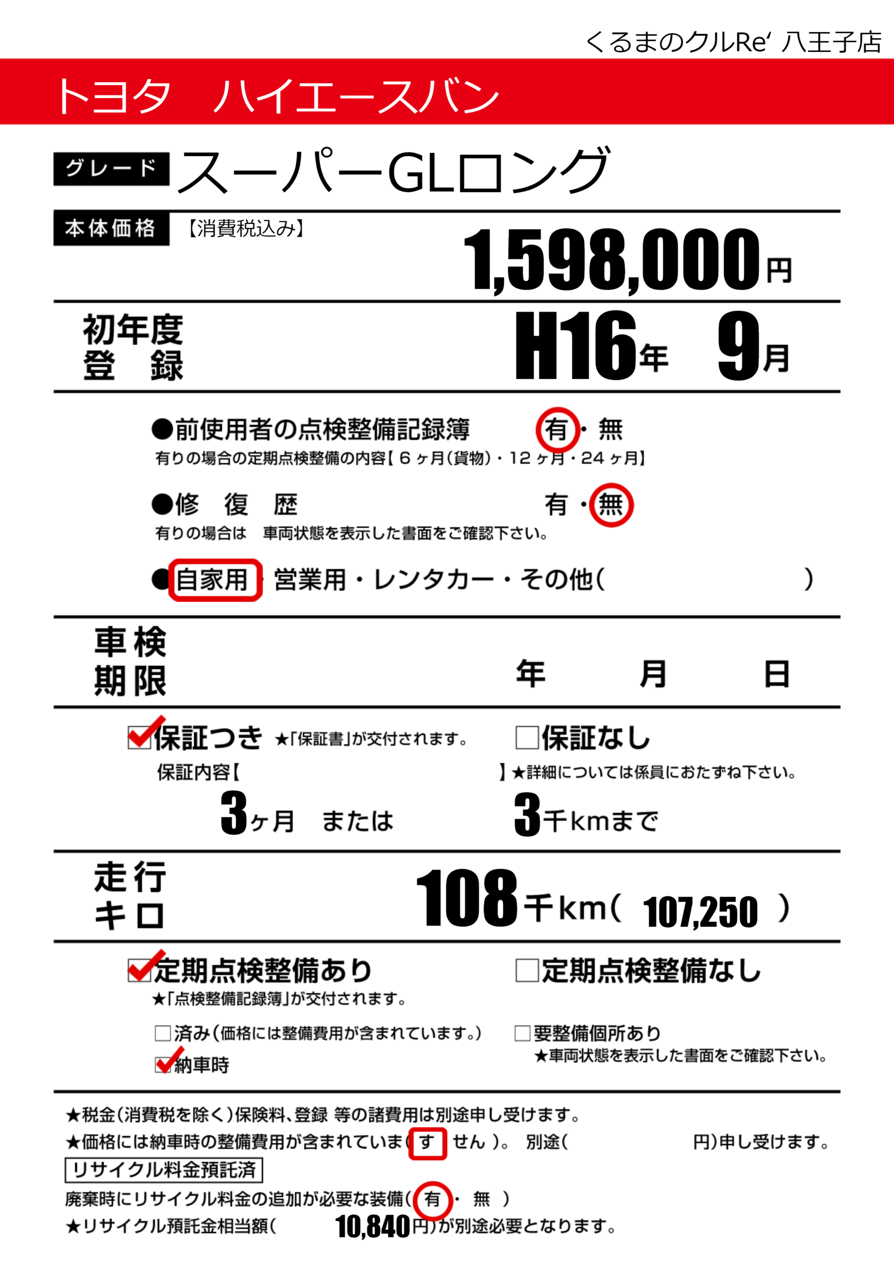 | 走行キロ | 10.8万km | 初年度登録 | H16年9月 |