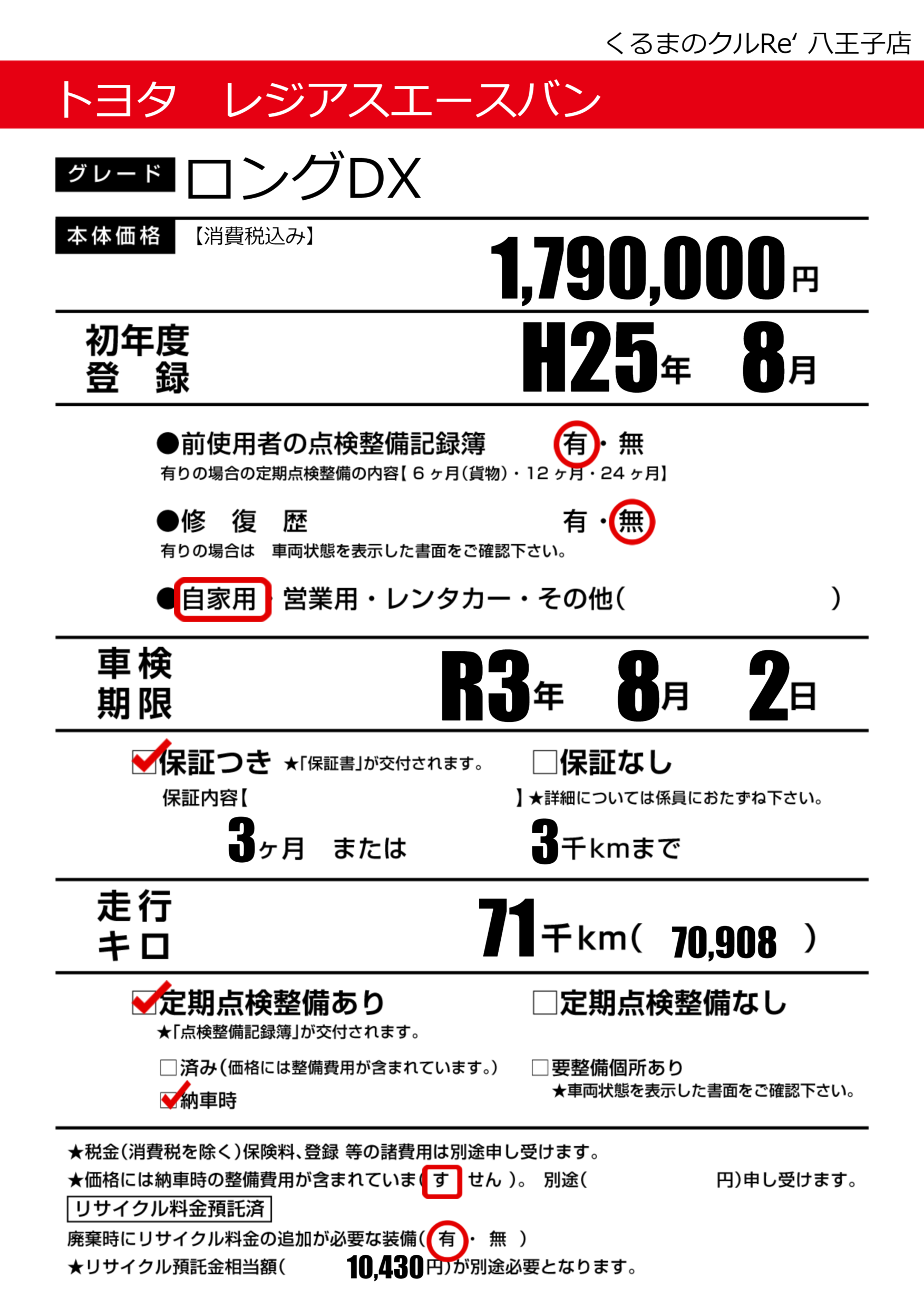 | 定期点検整備 | 定期点検整備あり 納車時あり | ||