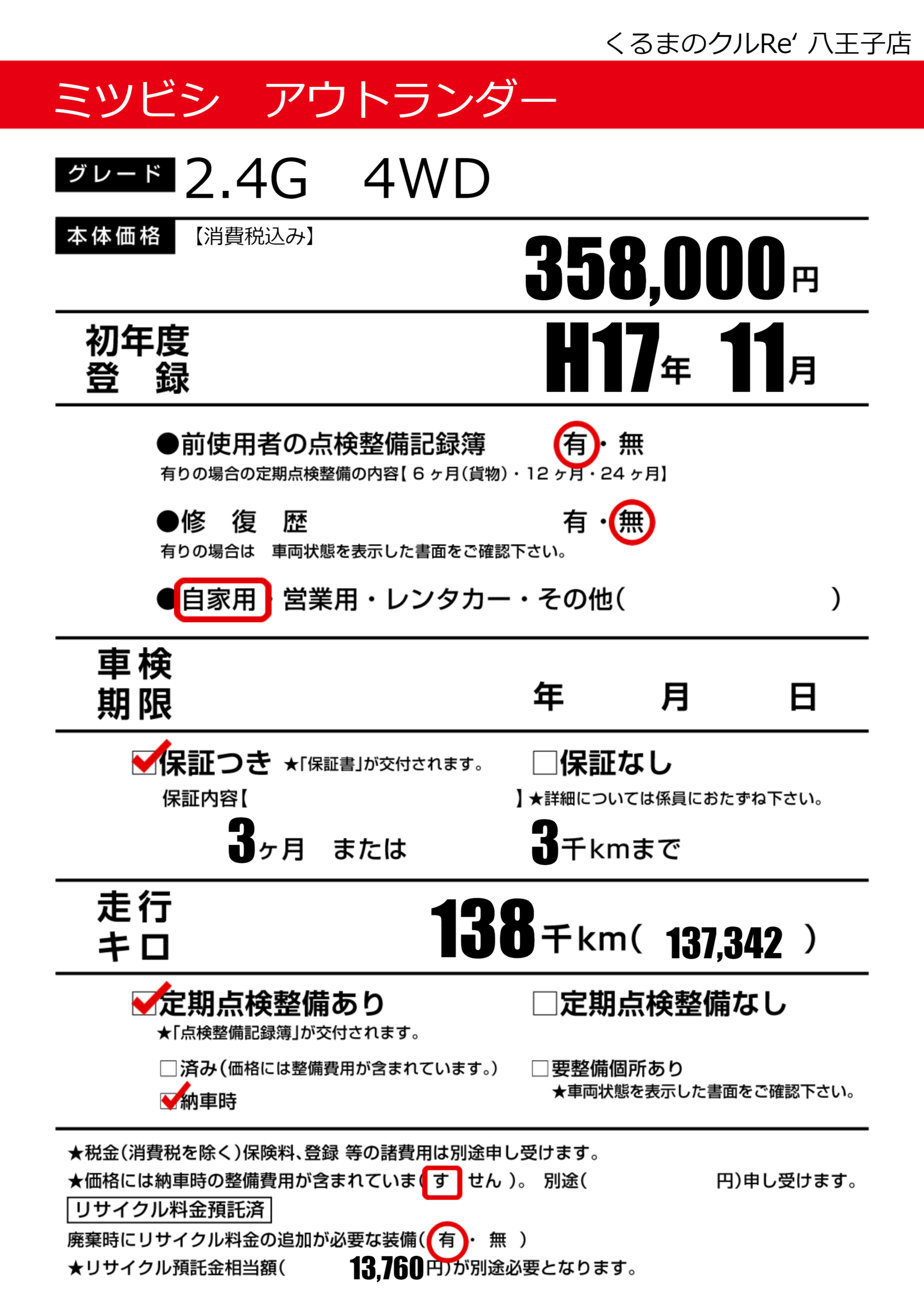 | 走行キロ | 13.8万km | 初年度登録 | H17年11月 |