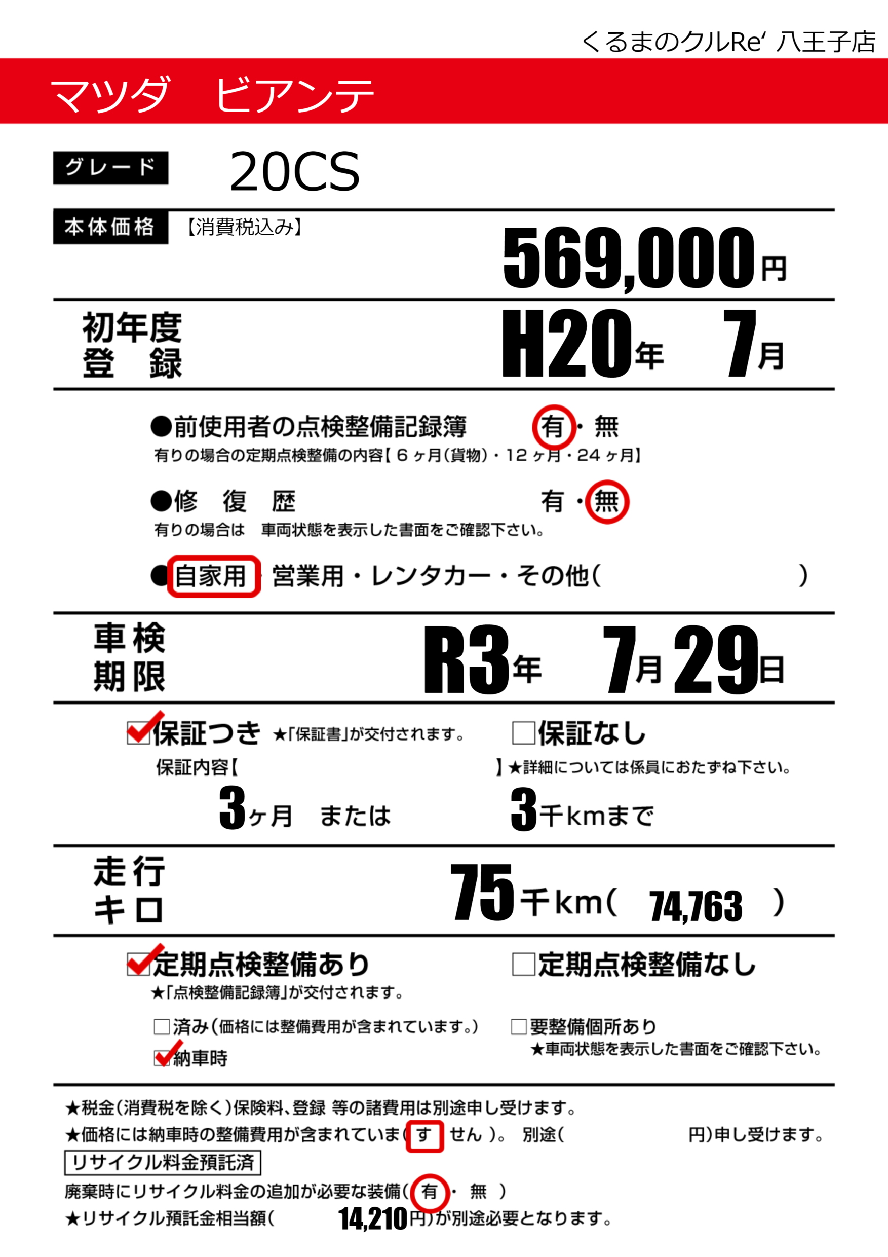 | 車名 | マツダ ビアンテ | グレード ミッション 排気量 |
