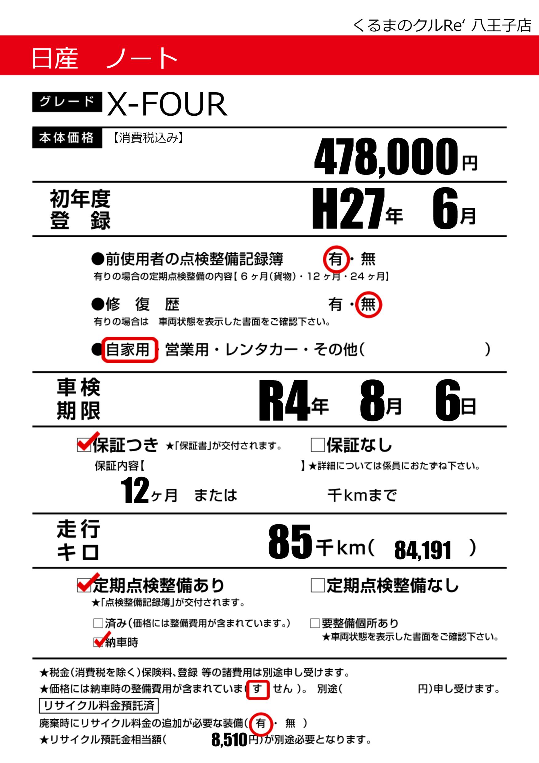 | 車名 | 日産 ノート | グレード ミッション 排気量 |