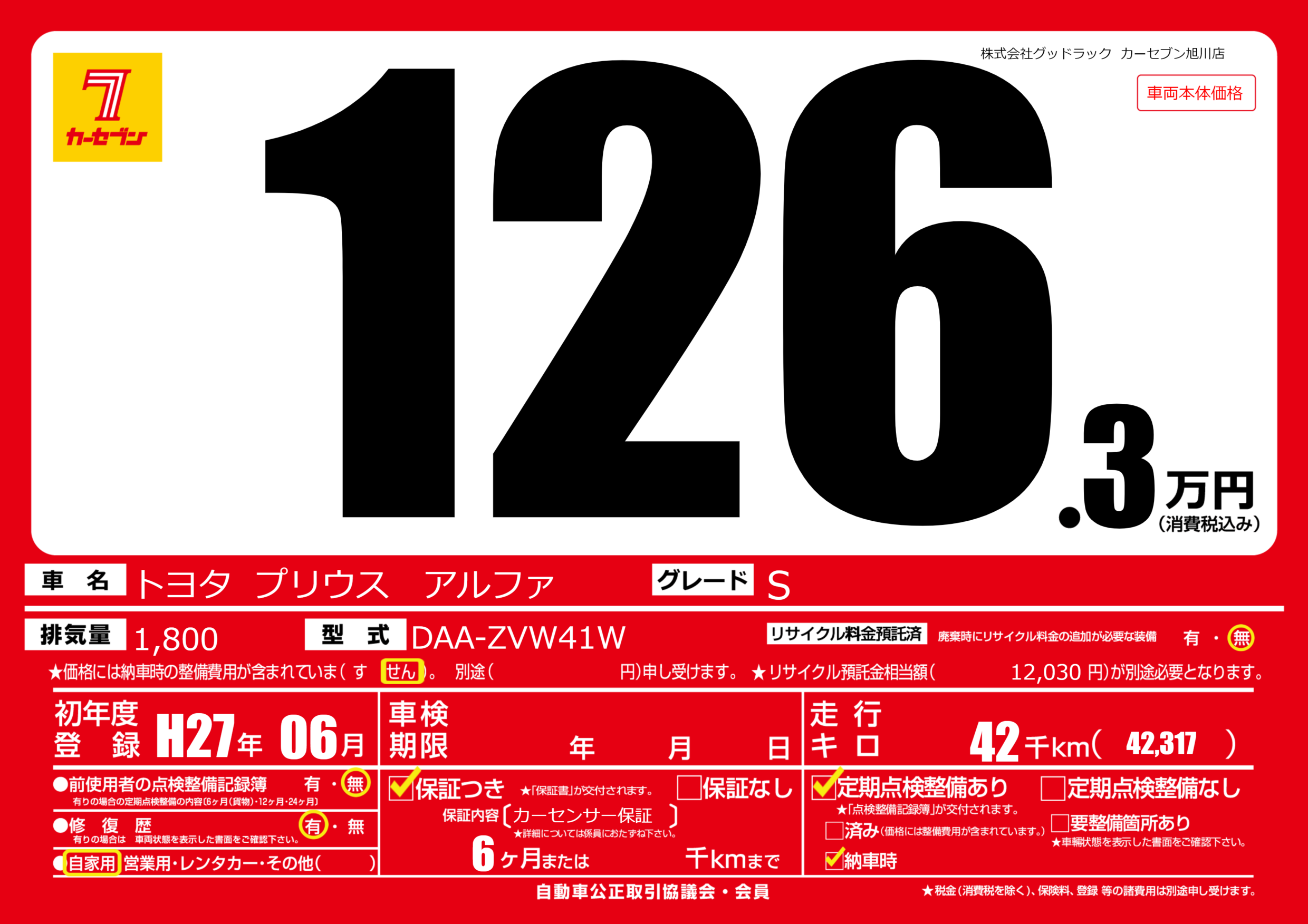 保証付き 保証内容(カーセンサー保証) 6ヶ月または()千kmまで |