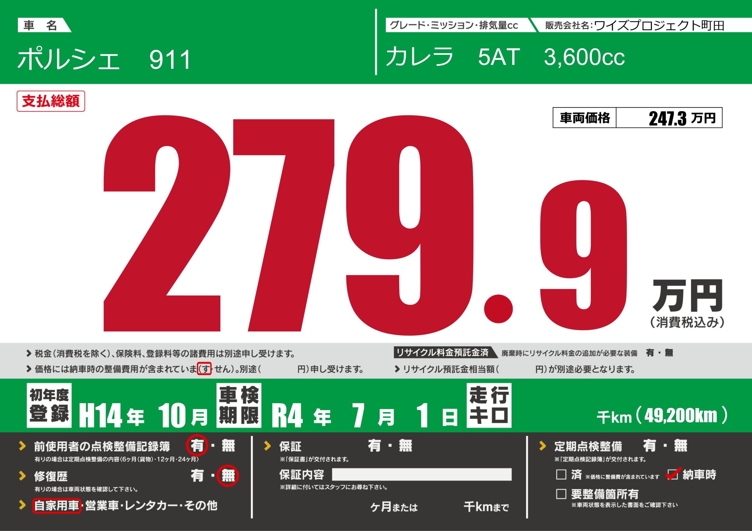 | 車名 | ポルシェ 911 | グレード ミッション 排気量 |