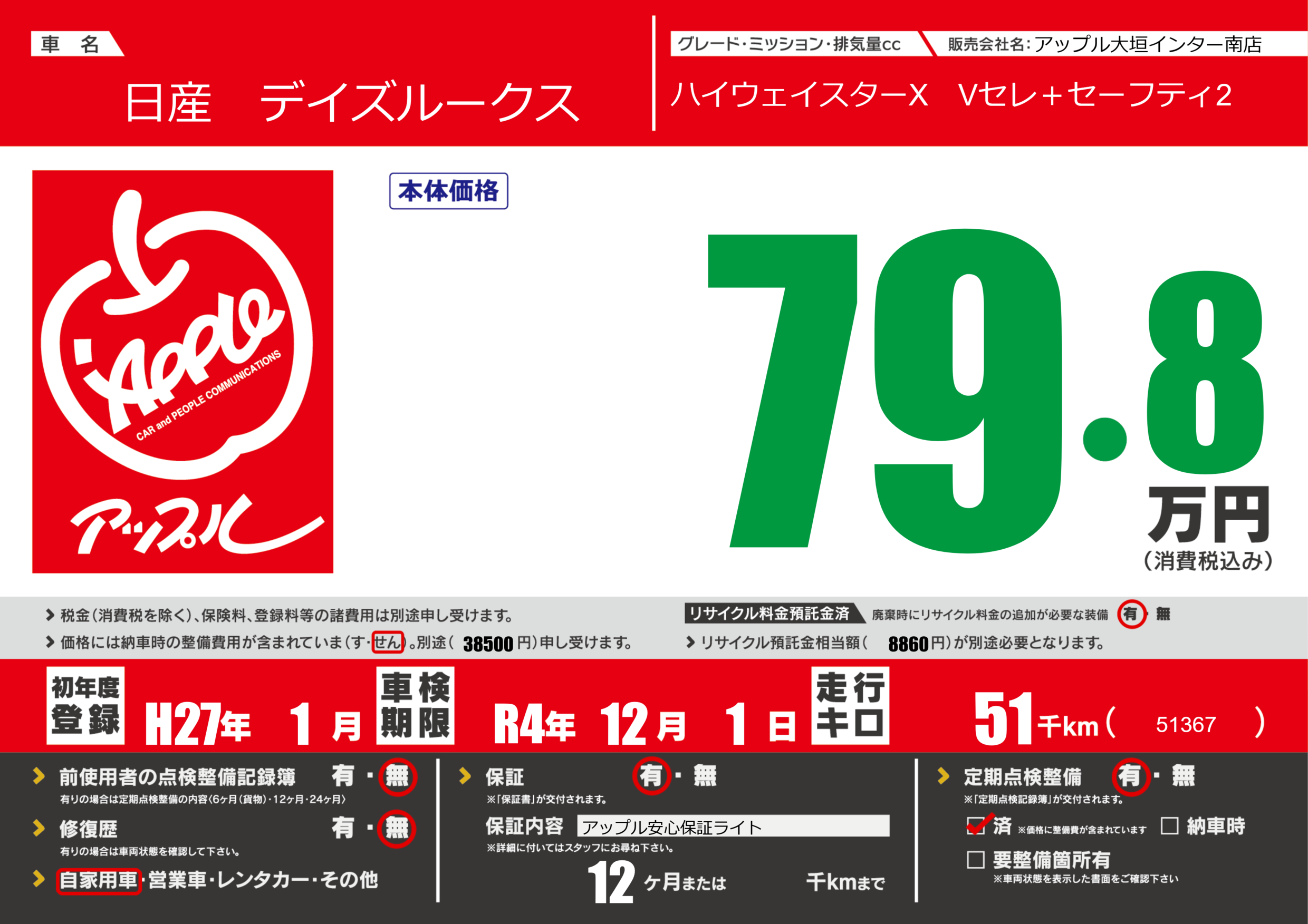 | 定期点検整備 | 定期点検整備あり 定期点検整備済み | ||