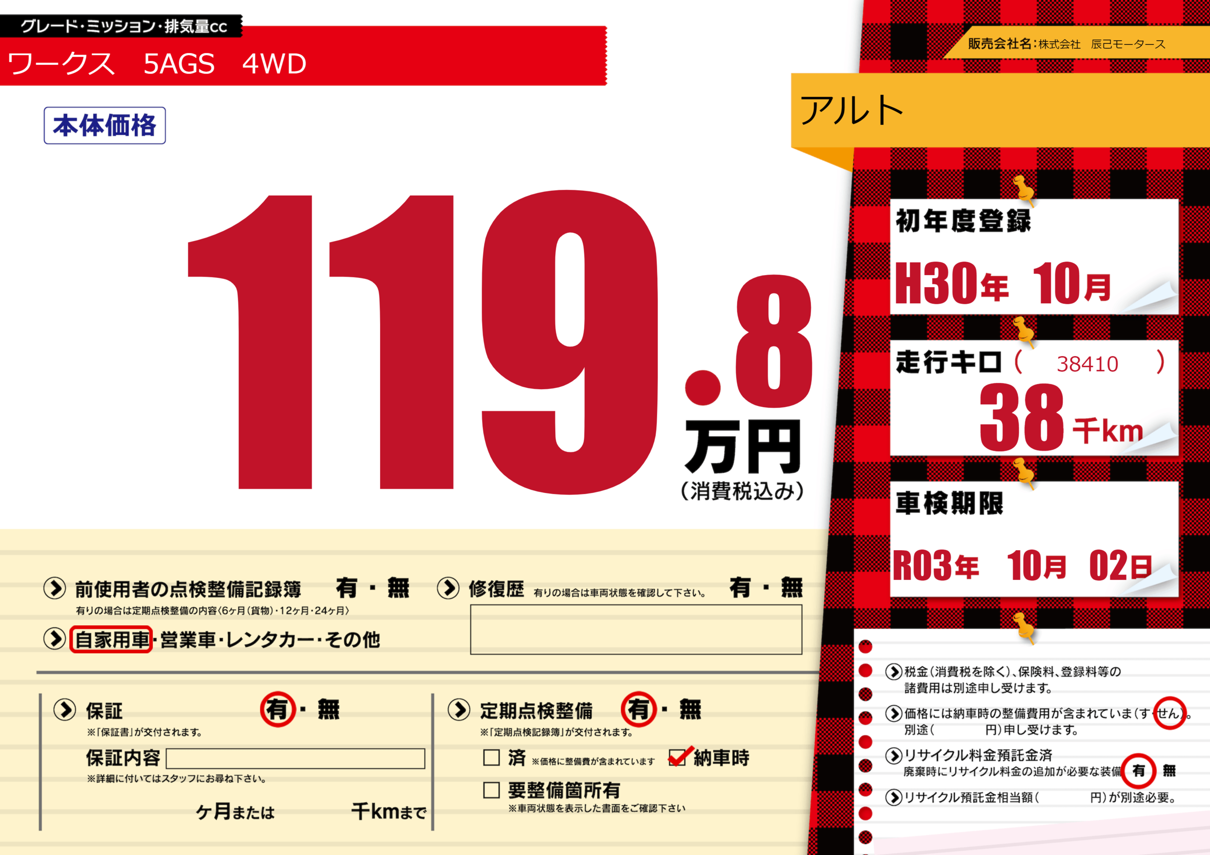| 定期点検整備 | 定期点検整備あり 納車時あり | ||