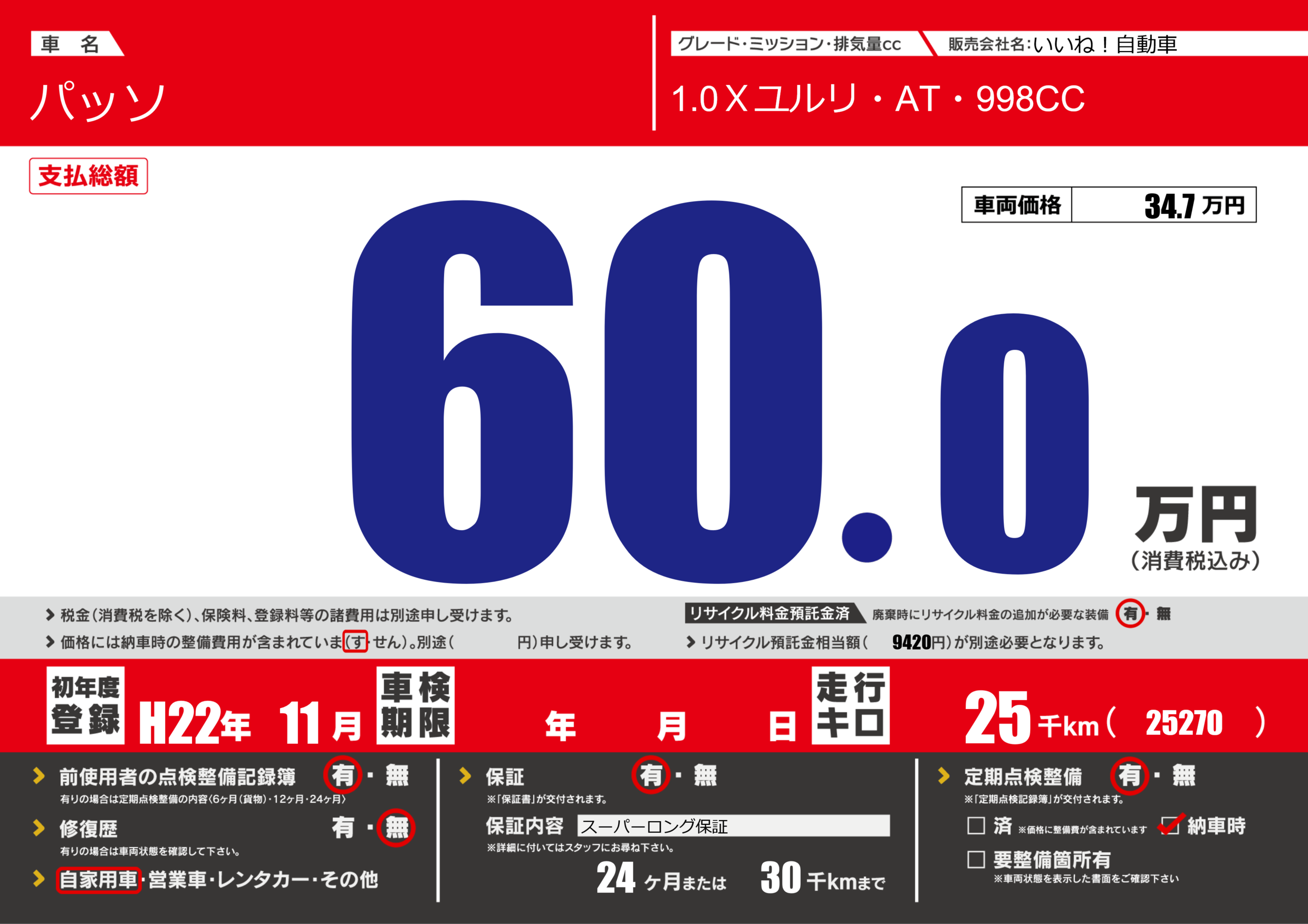 保証付き 保証内容(スーパーロング保証) 24ヶ月または(30)千kmまで |