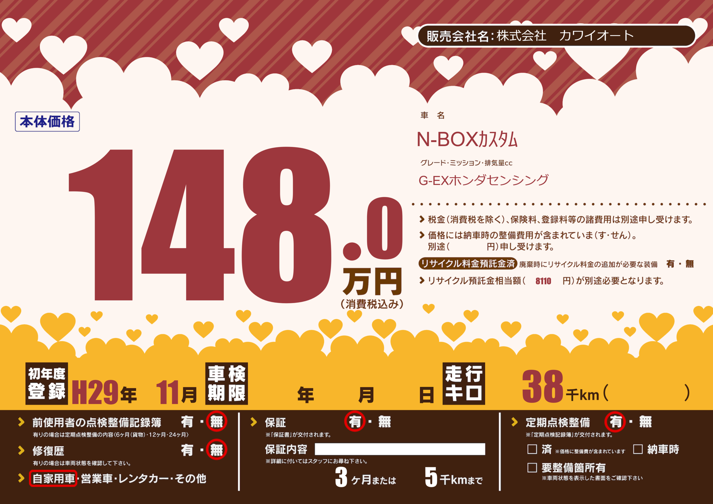 | 走行キロ | 3.8万km | 初年度登録 | H29年11月 |