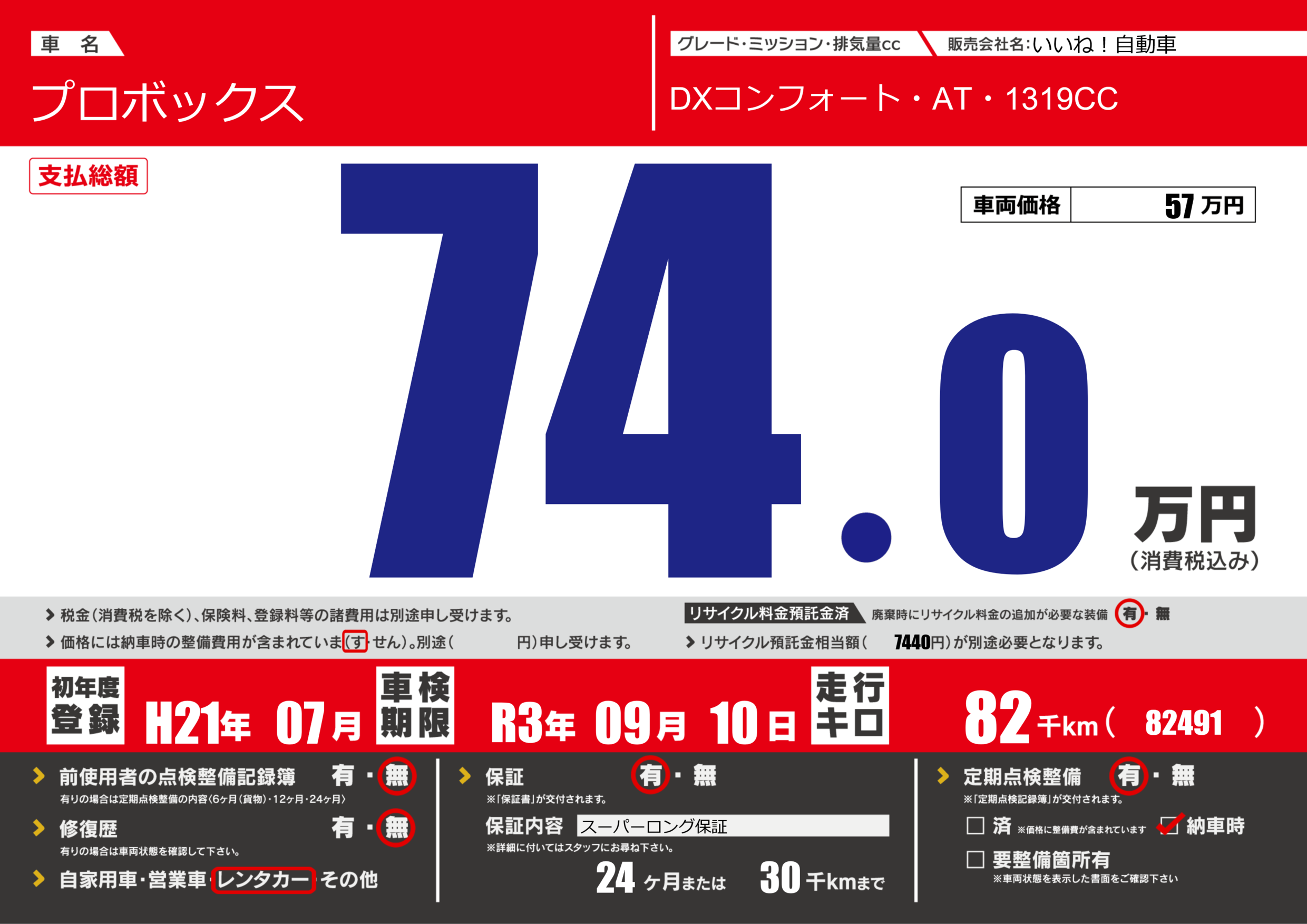 | 車名 | プロボックス | グレード ミッション 排気量 |