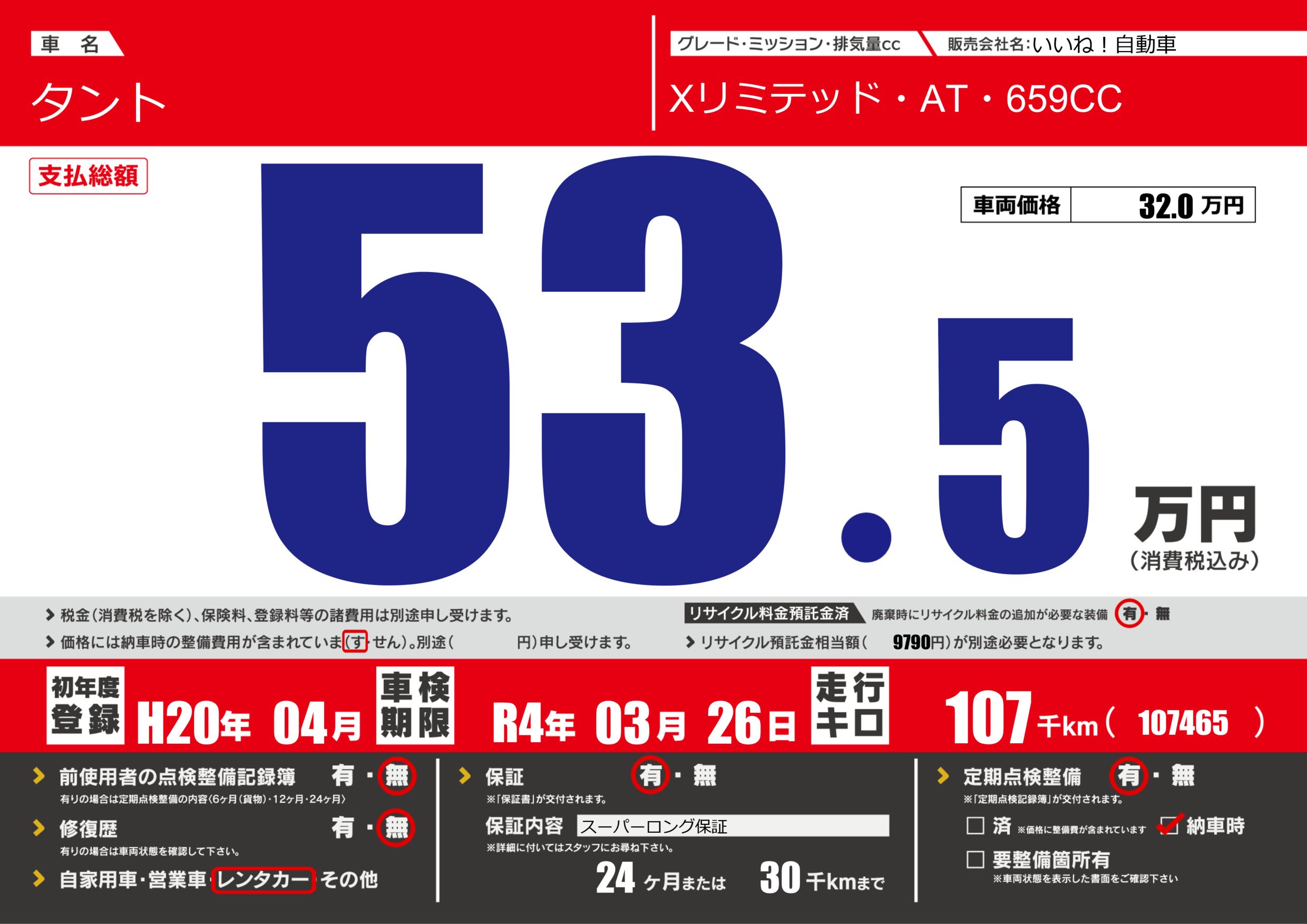 保証付き 保証内容(スーパーロング保証) 24ヶ月または(30)千kmまで |