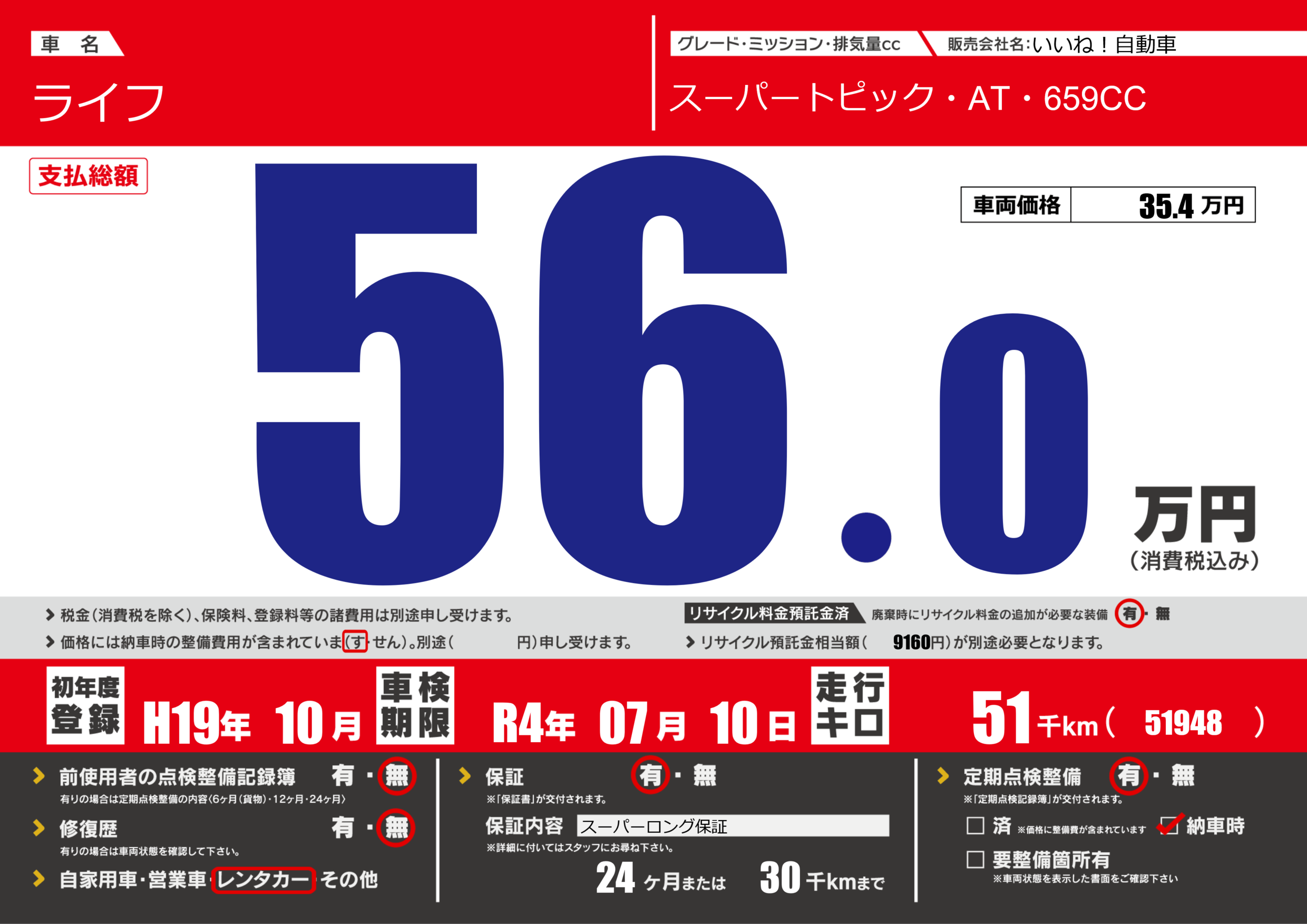 | 車名 | ライフ | グレード ミッション 排気量 |
