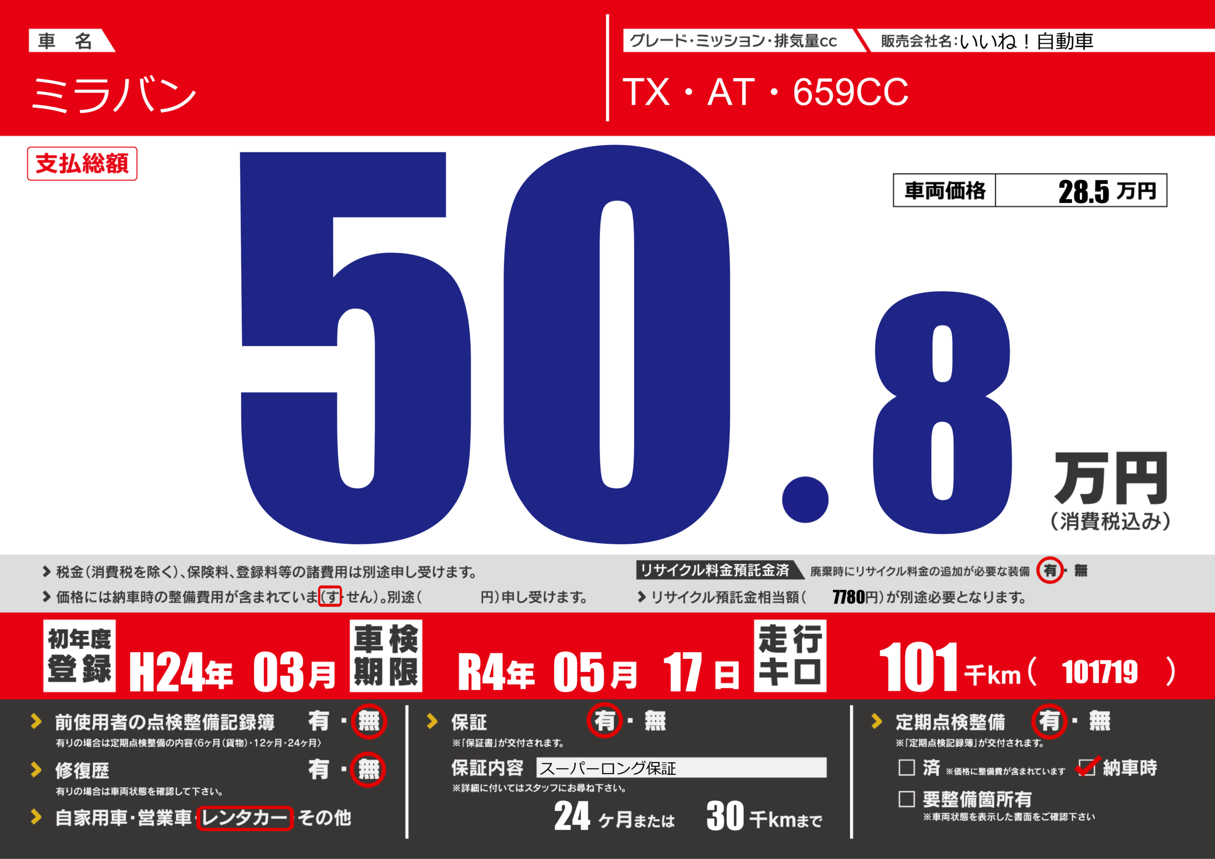 保証付き 保証内容(スーパーロング保証) 24ヶ月または(30)千kmまで |