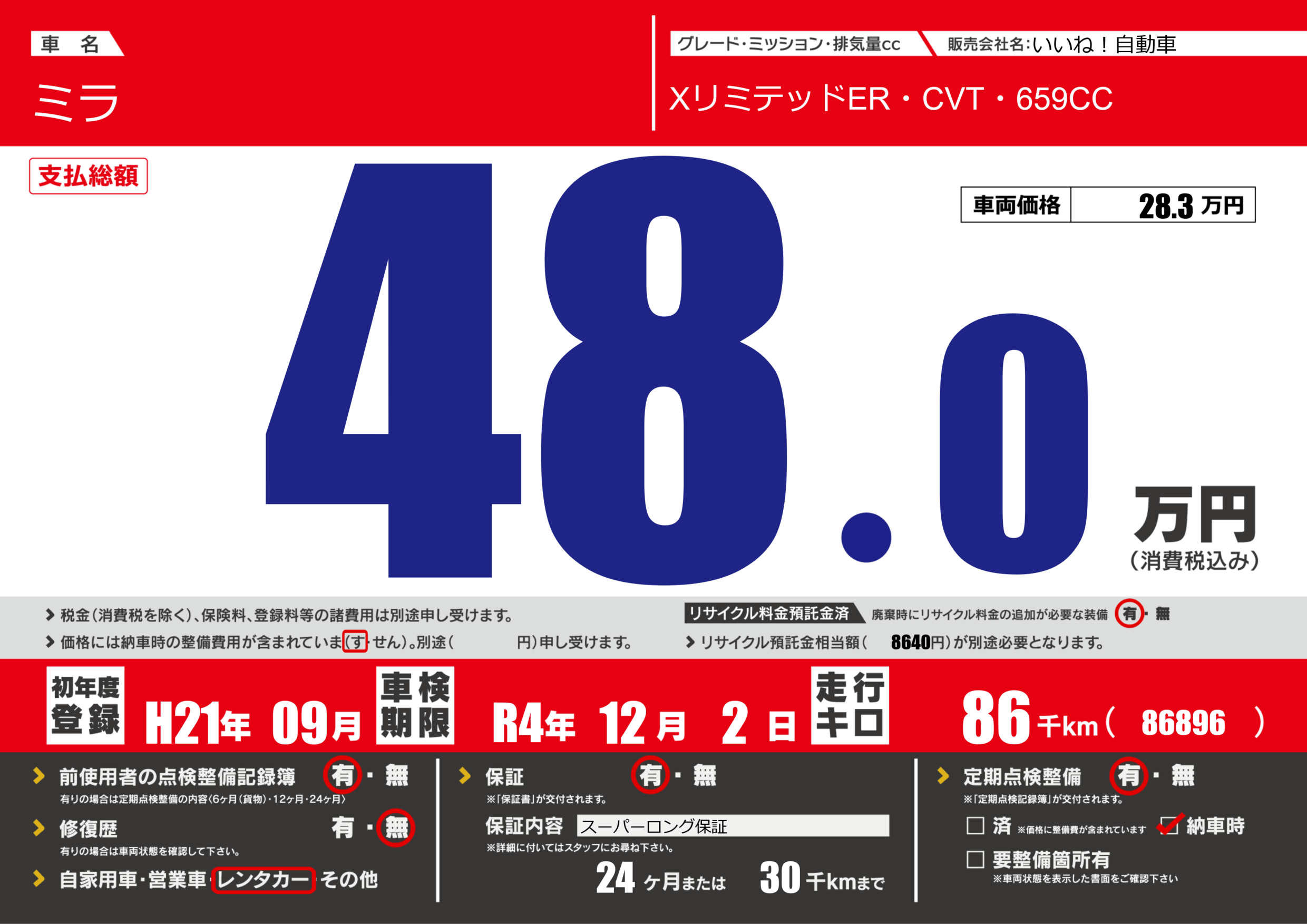 保証付き 保証内容(スーパーロング保証) 24ヶ月または(30)千kmまで |