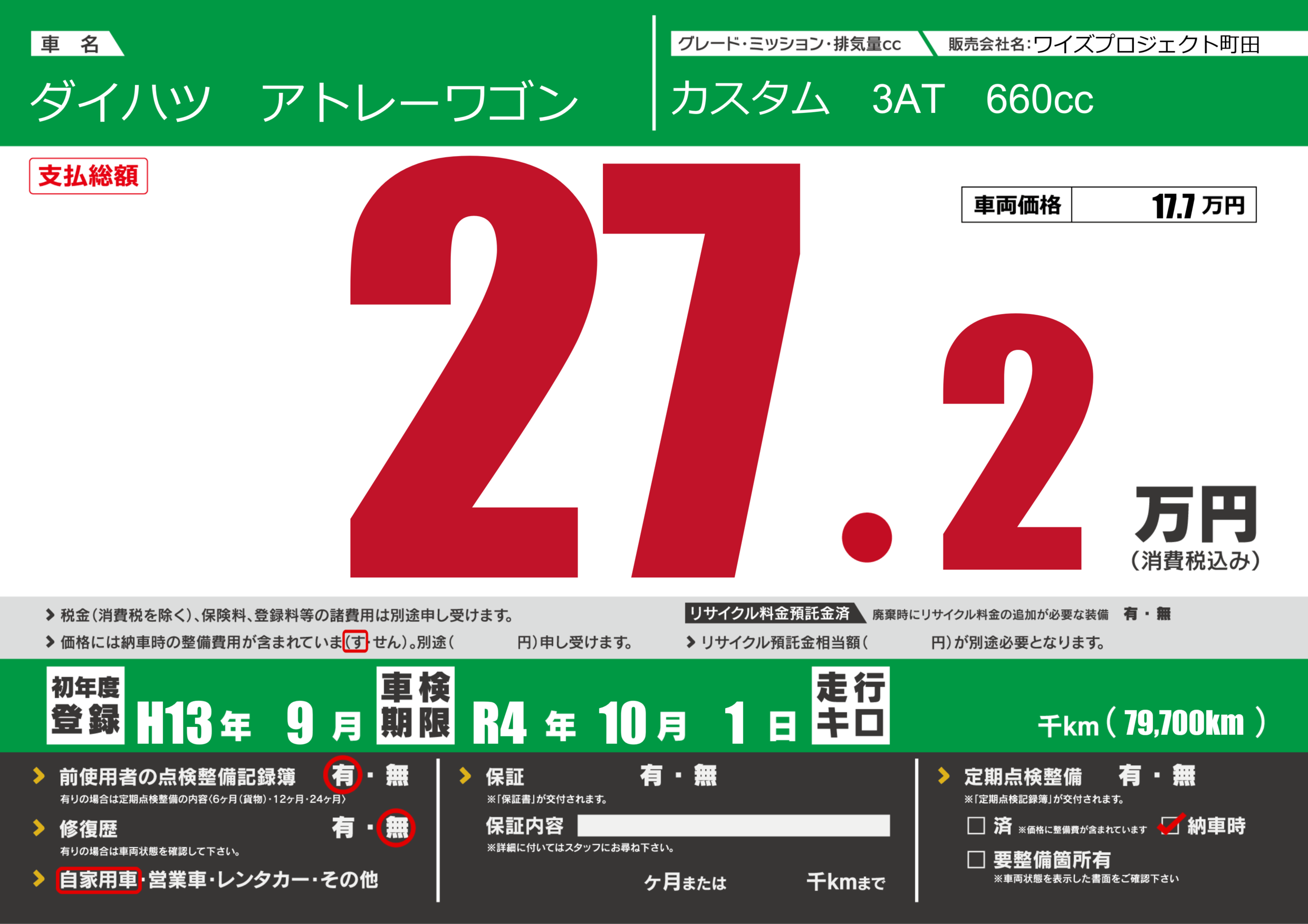 | 車名 | ダイハツ アトレーワゴン | グレード ミッション 排気量 |