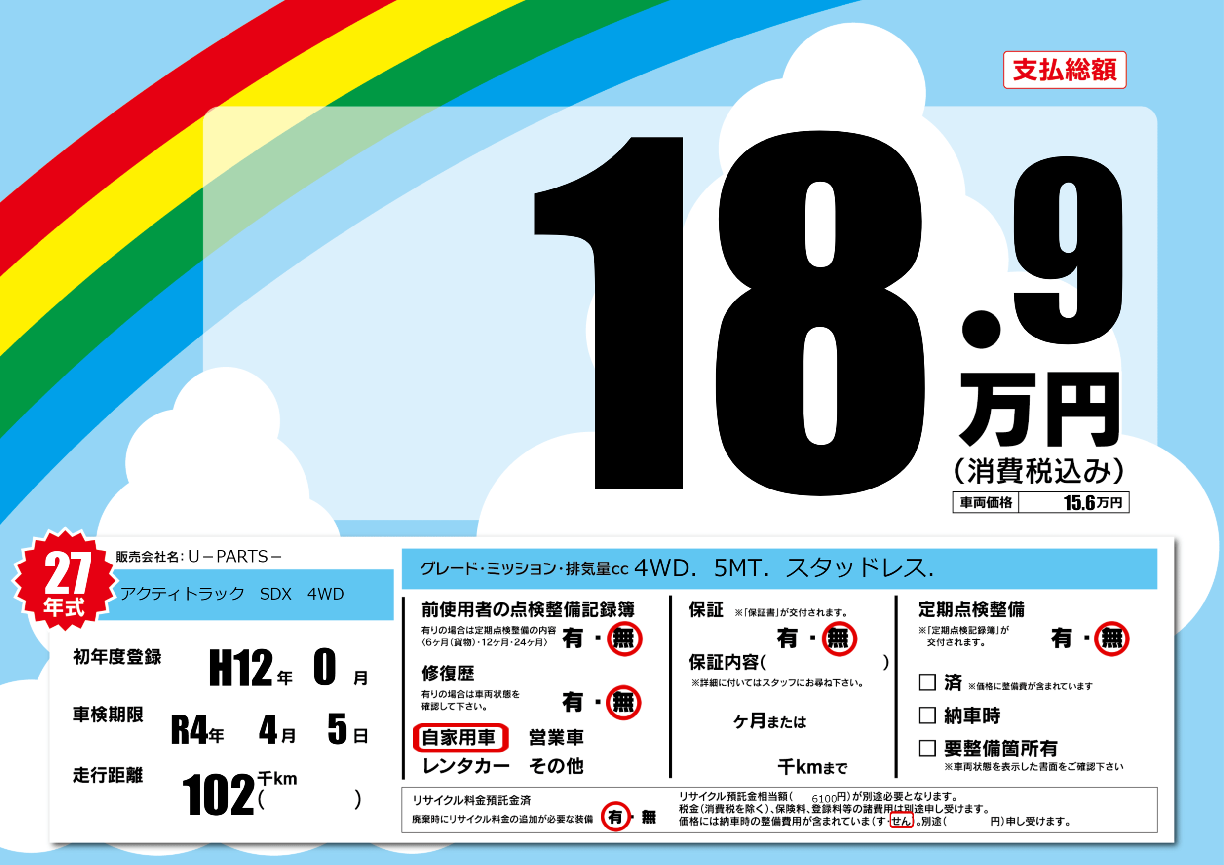 | 車名 | アクティトラック SDX 4WD | グレード ミッション 排気量 |