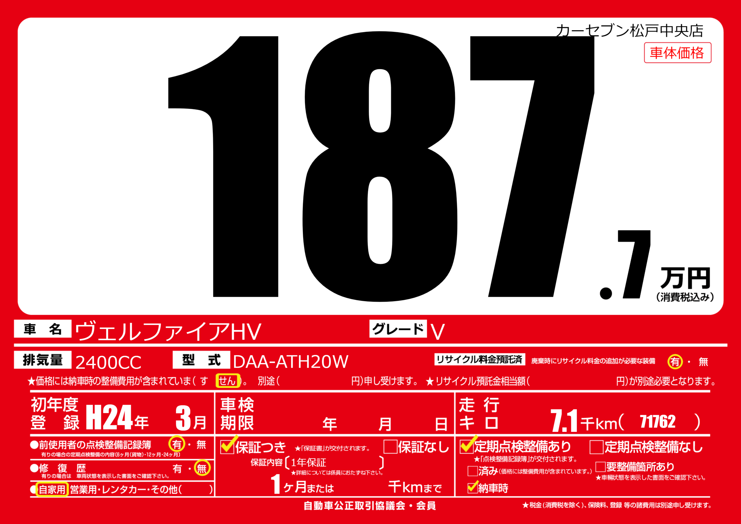 | 車名 | ヴェルファイアHV | グレード ミッション 排気量 |