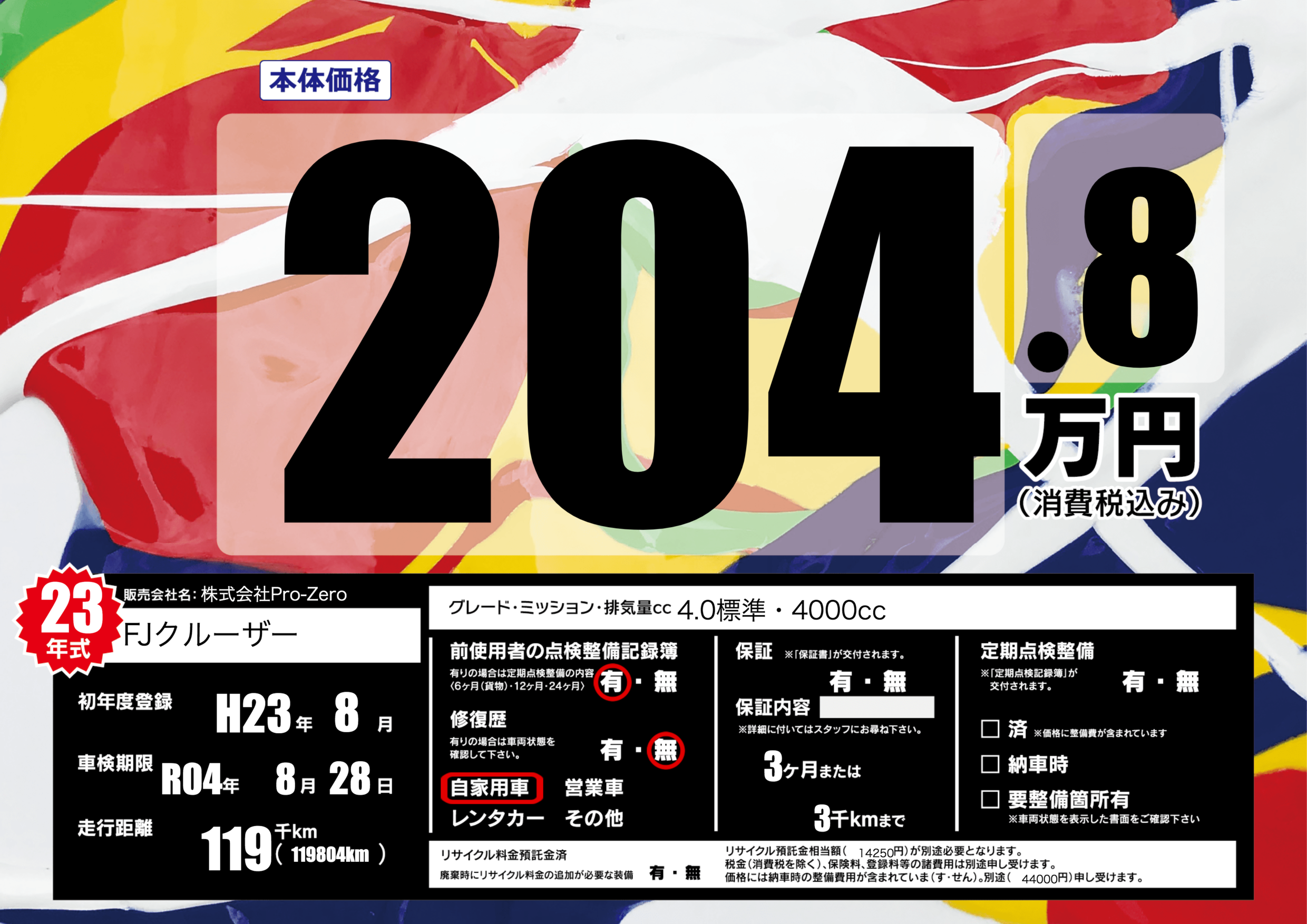 | 走行キロ | 11.9万km | 初年度登録 | H23年8月 |