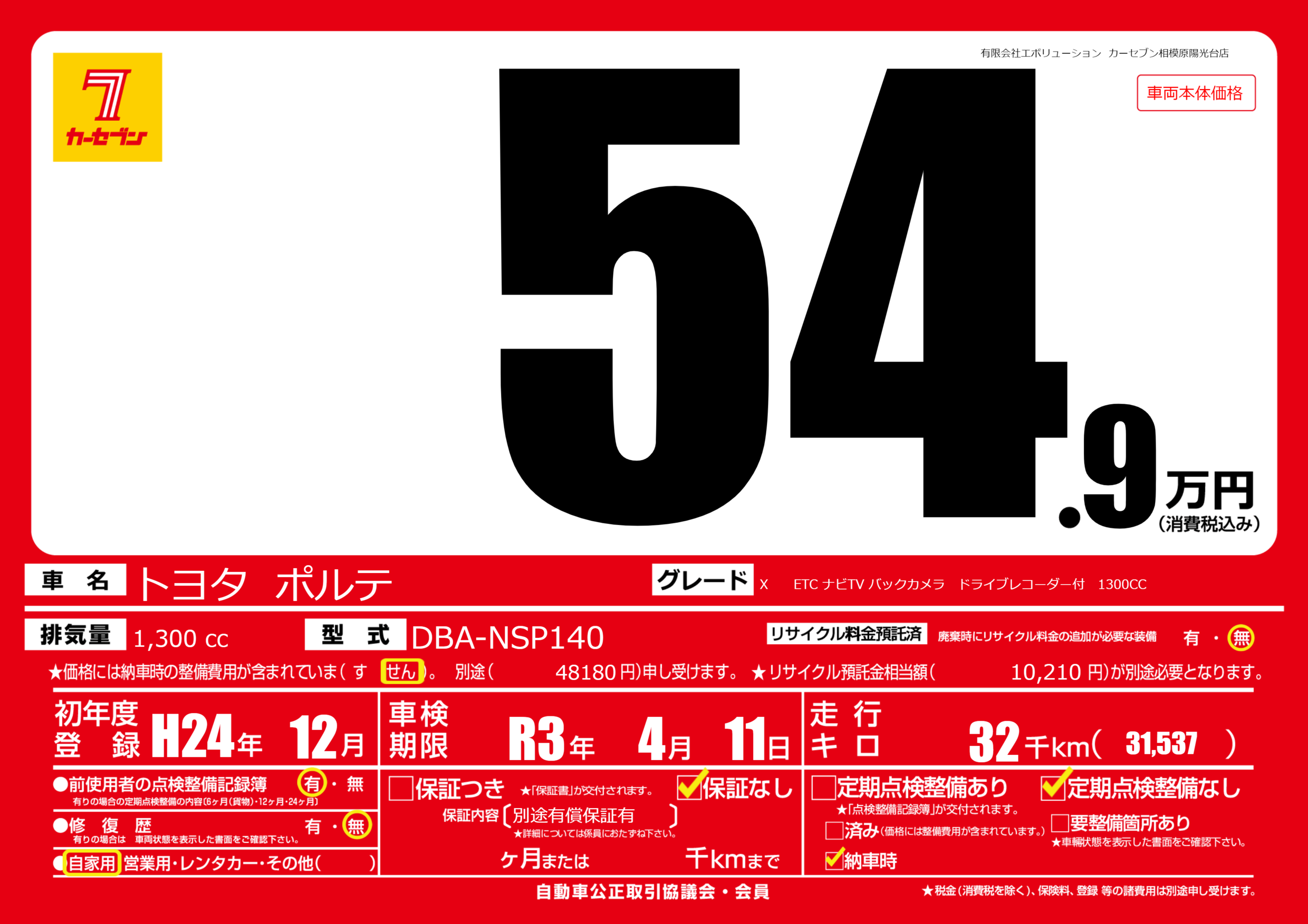X ETC ナビTV バックカメラ ドライブレコーダー付 1300CC |