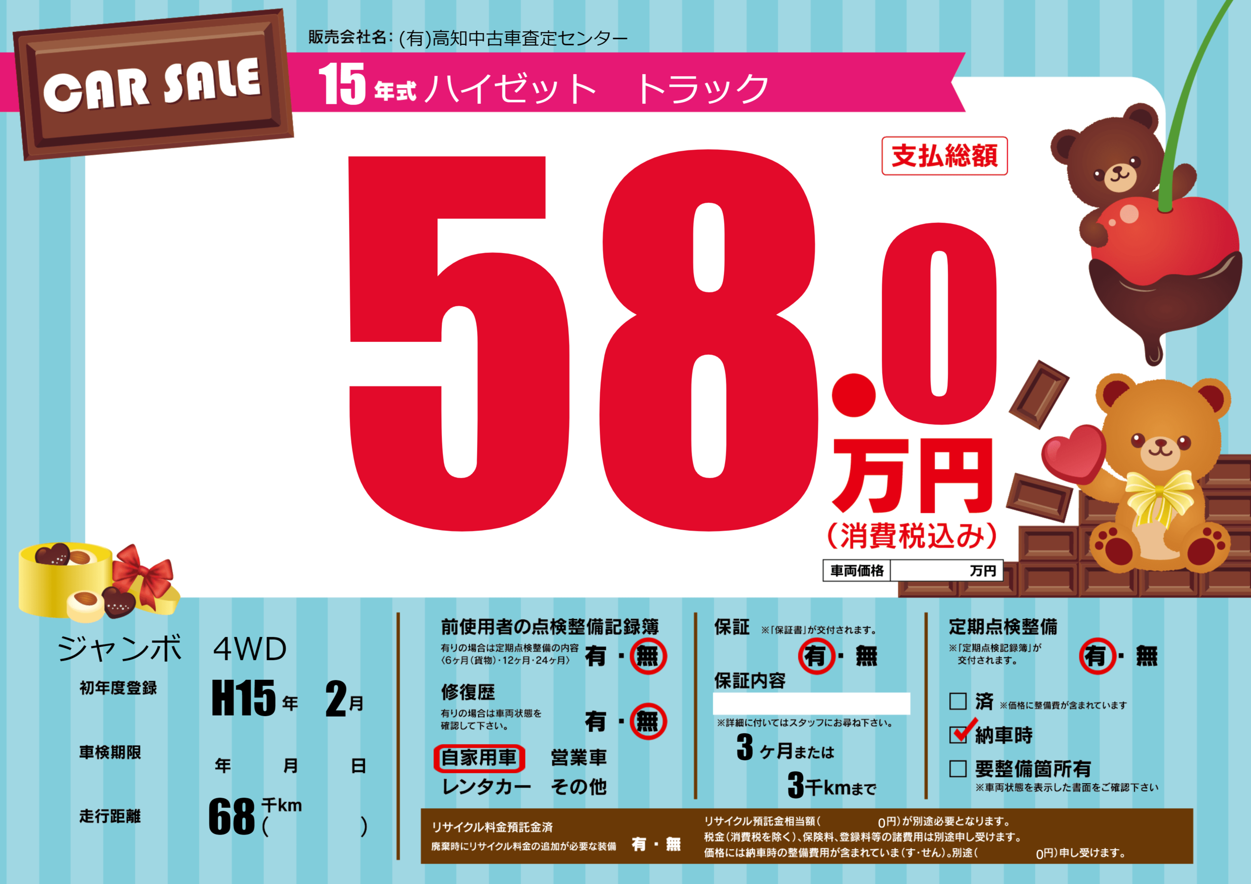 | 走行キロ | 6.8万km | 初年度登録 | H15年2月 |
