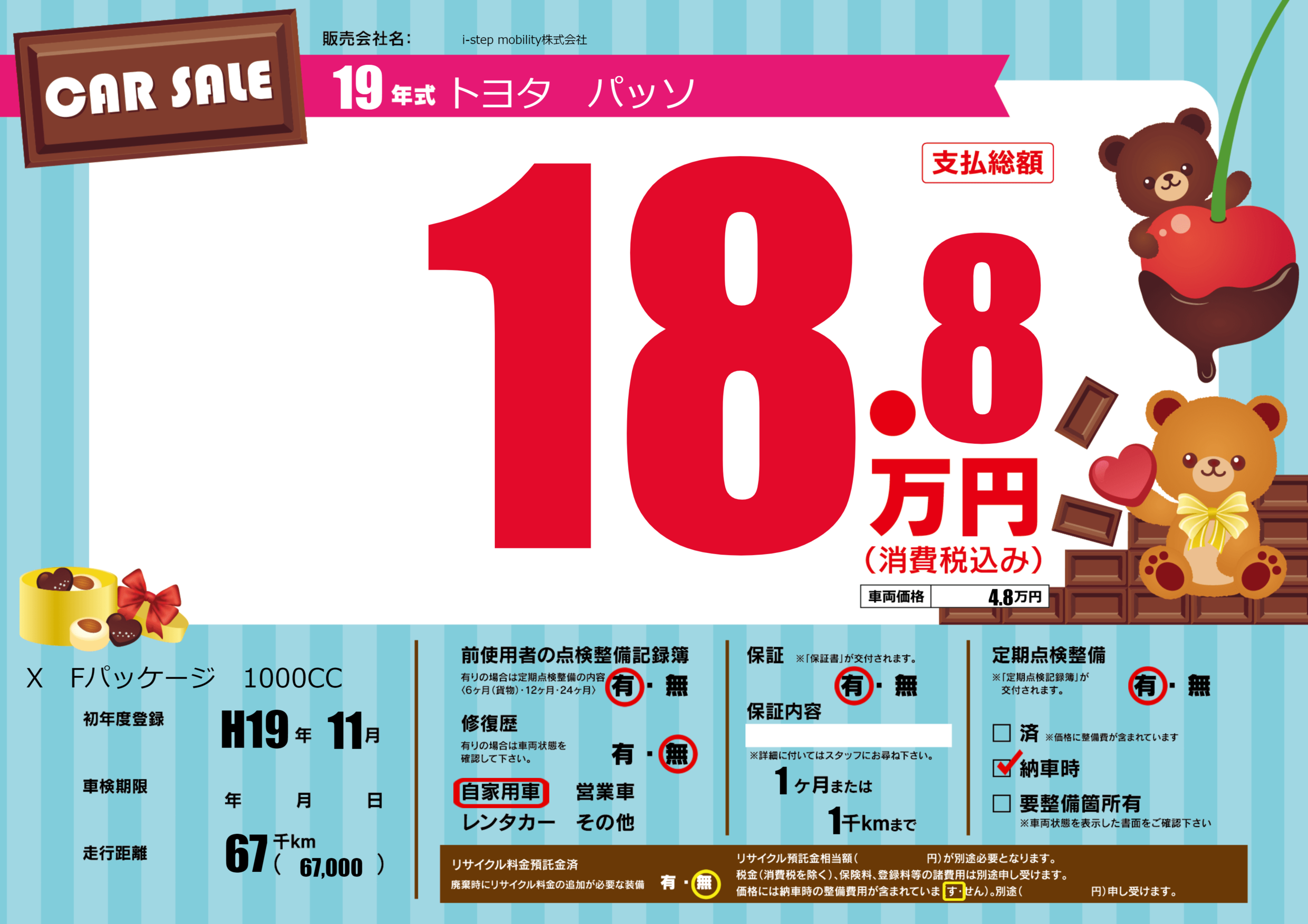 | 車名 | トヨタ パッソ | グレード ミッション 排気量 |