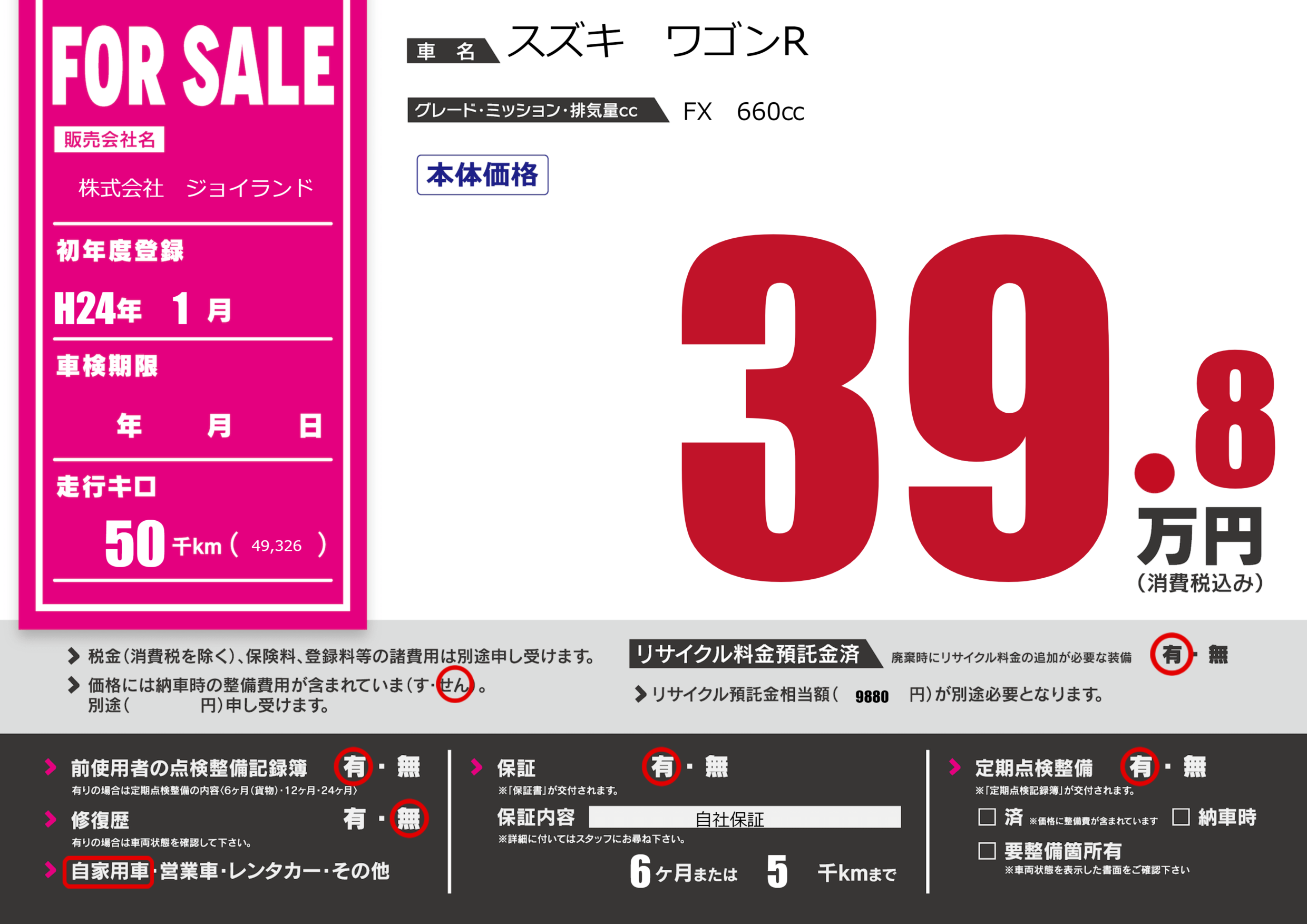 | 車名 | スズキ ワゴンR | グレード ミッション 排気量 |