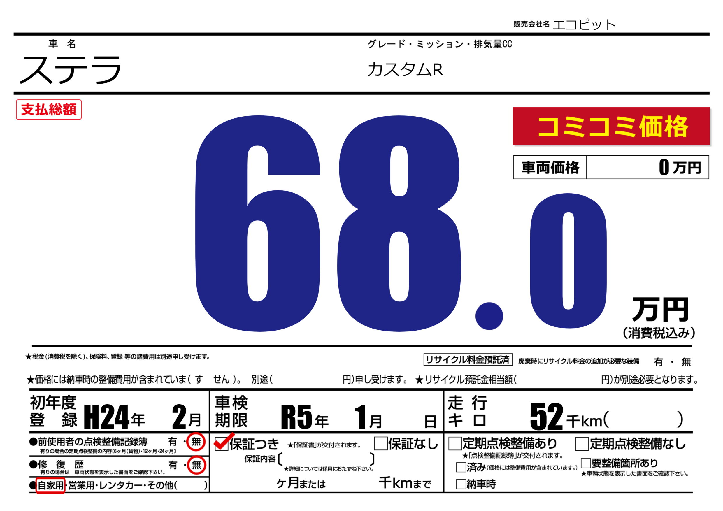 | 車名 | ステラ | グレード ミッション 排気量 |