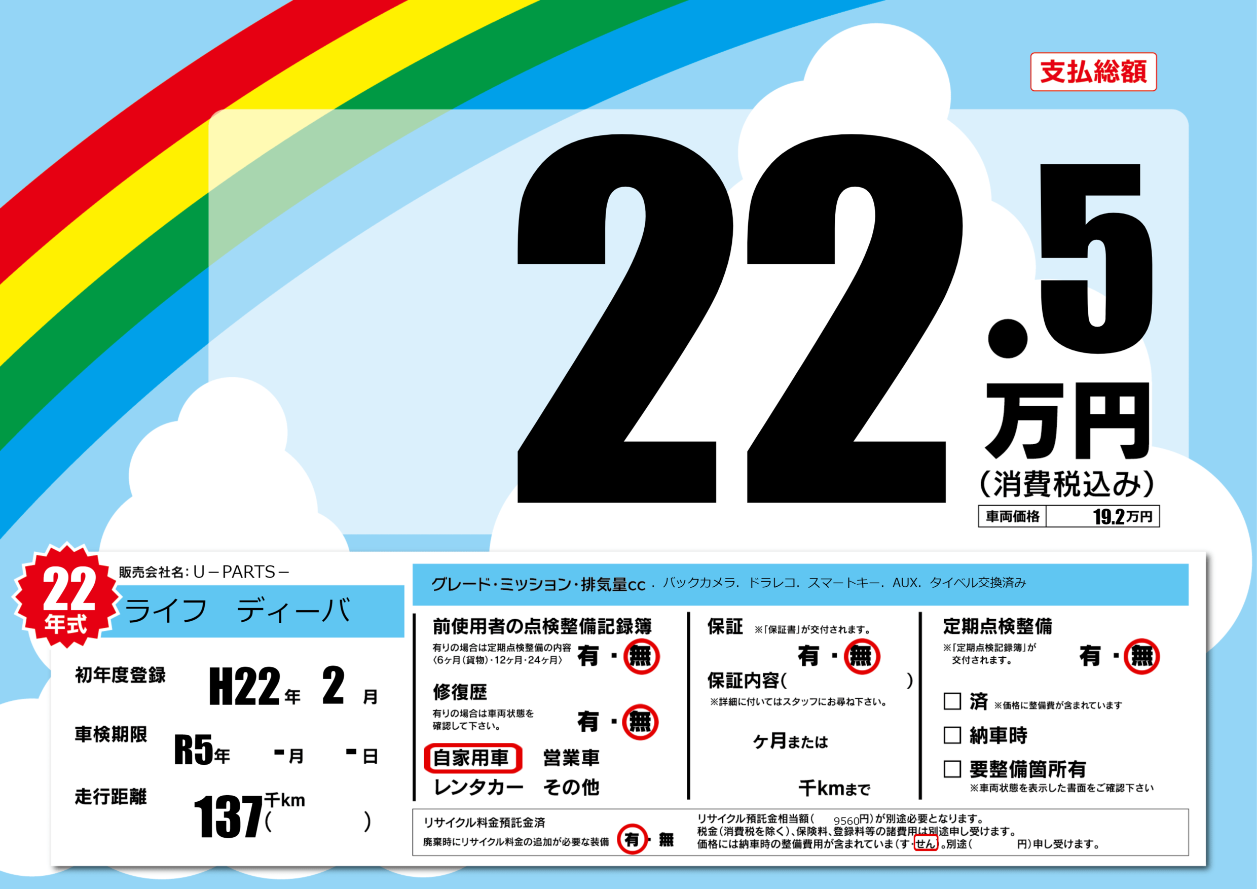 | 走行キロ | 13.7万km | 初年度登録 | H22年2月 |