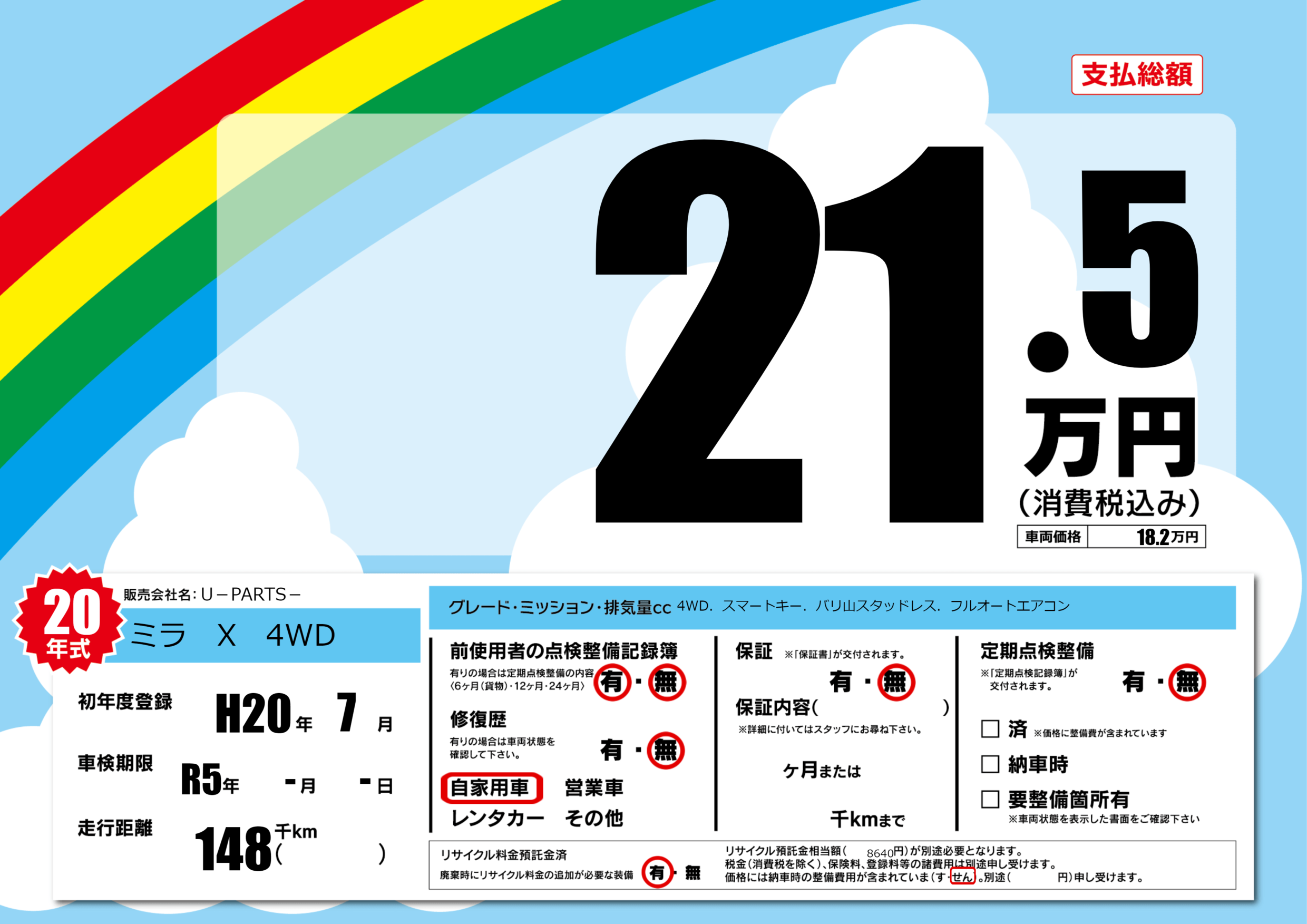 | 車名 | ミラ X 4WD | グレード ミッション 排気量 |