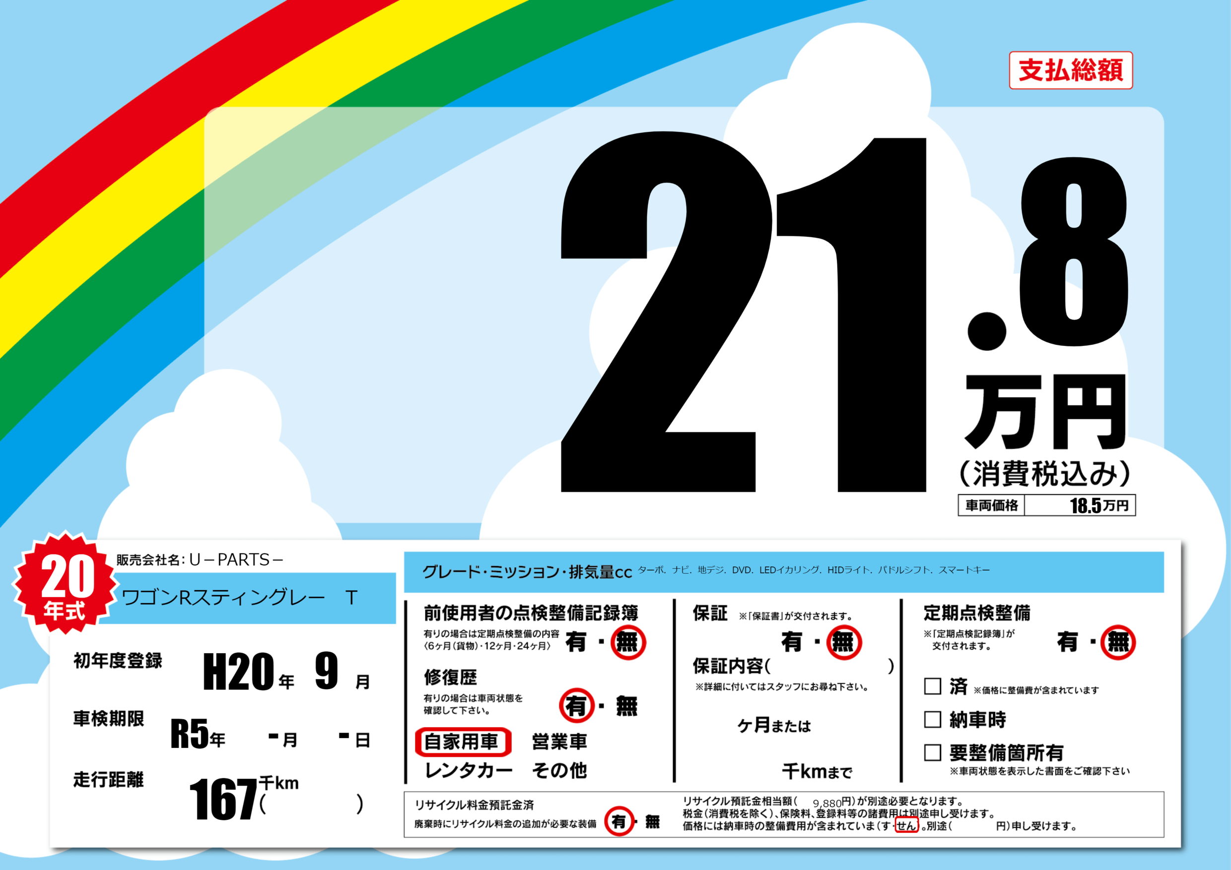 | 走行キロ | 16.7万km | 初年度登録 | H20年9月 |