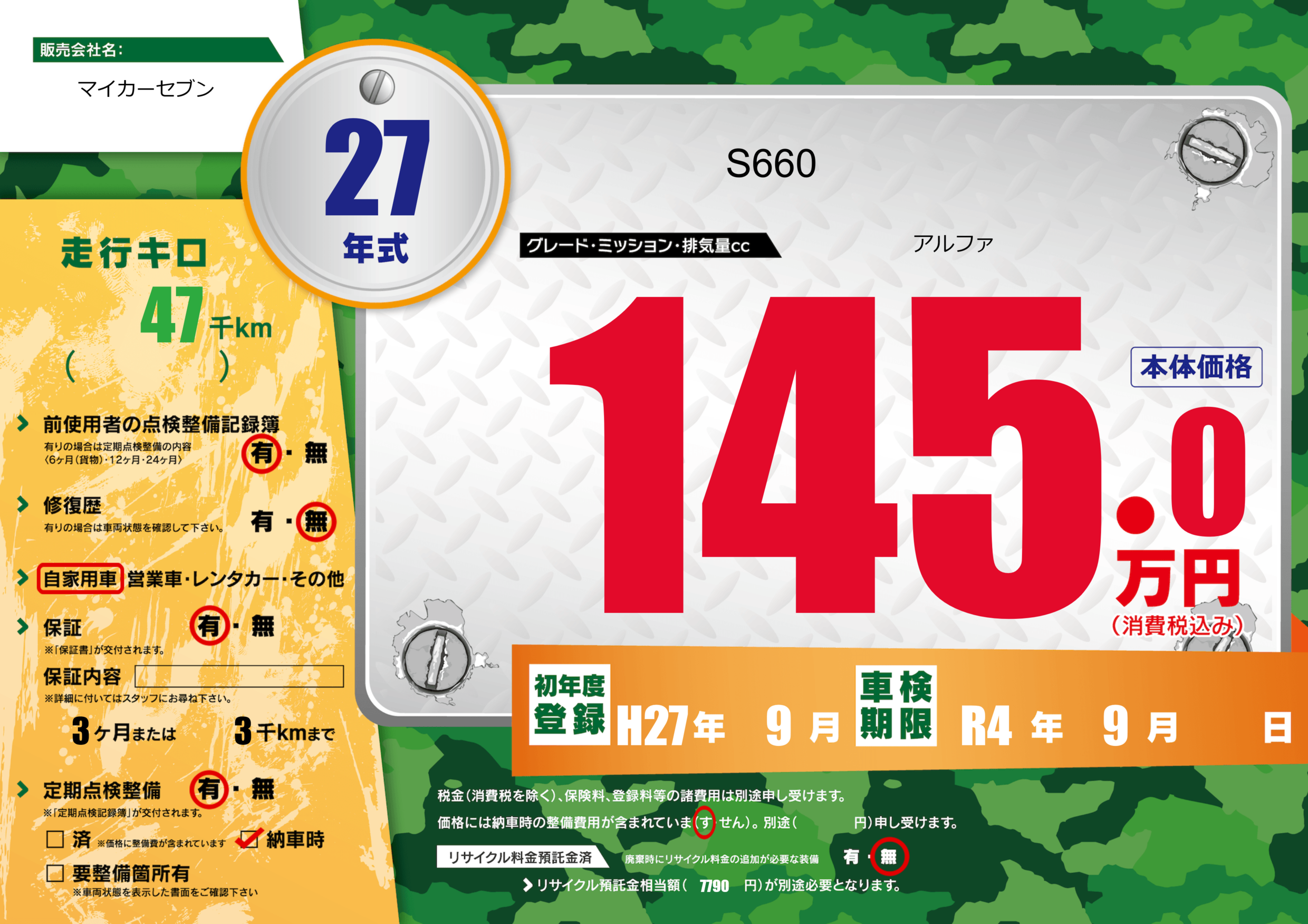 | 走行キロ | 4.7万km | 初年度登録 | H27年9月 |
