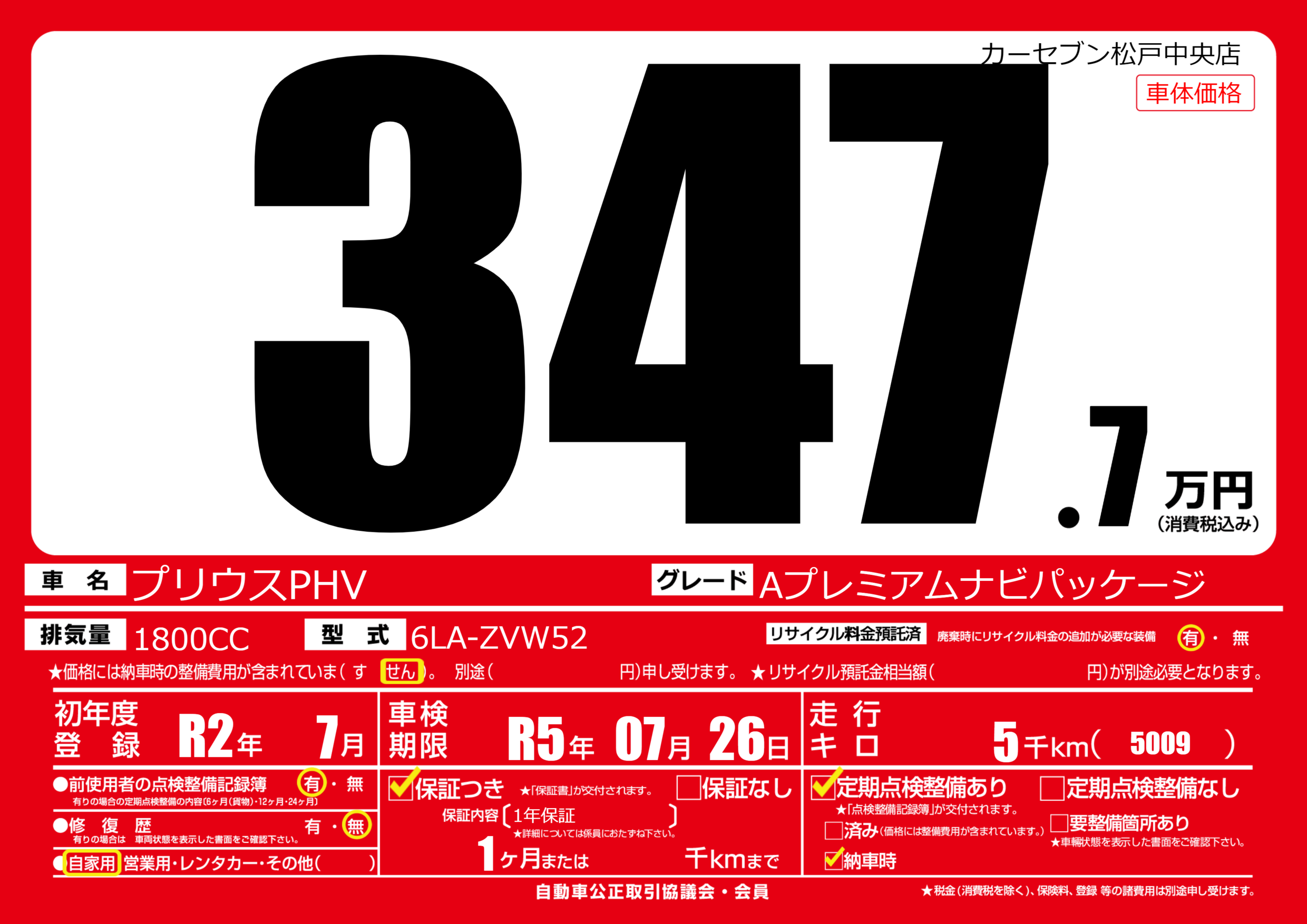 | 車名 | プリウスPHV | グレード ミッション 排気量 |