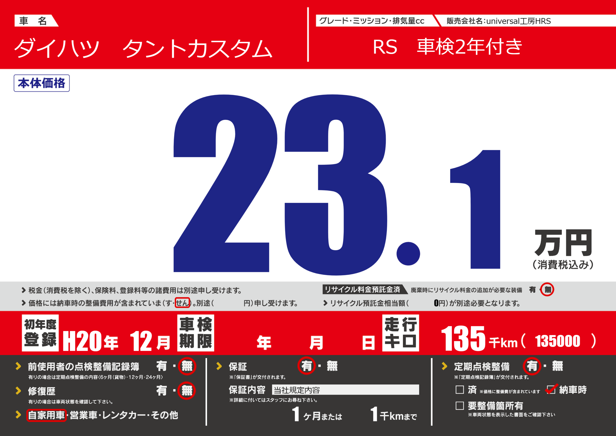 | 車名 | ダイハツ タントカスタム | グレード ミッション 排気量 |