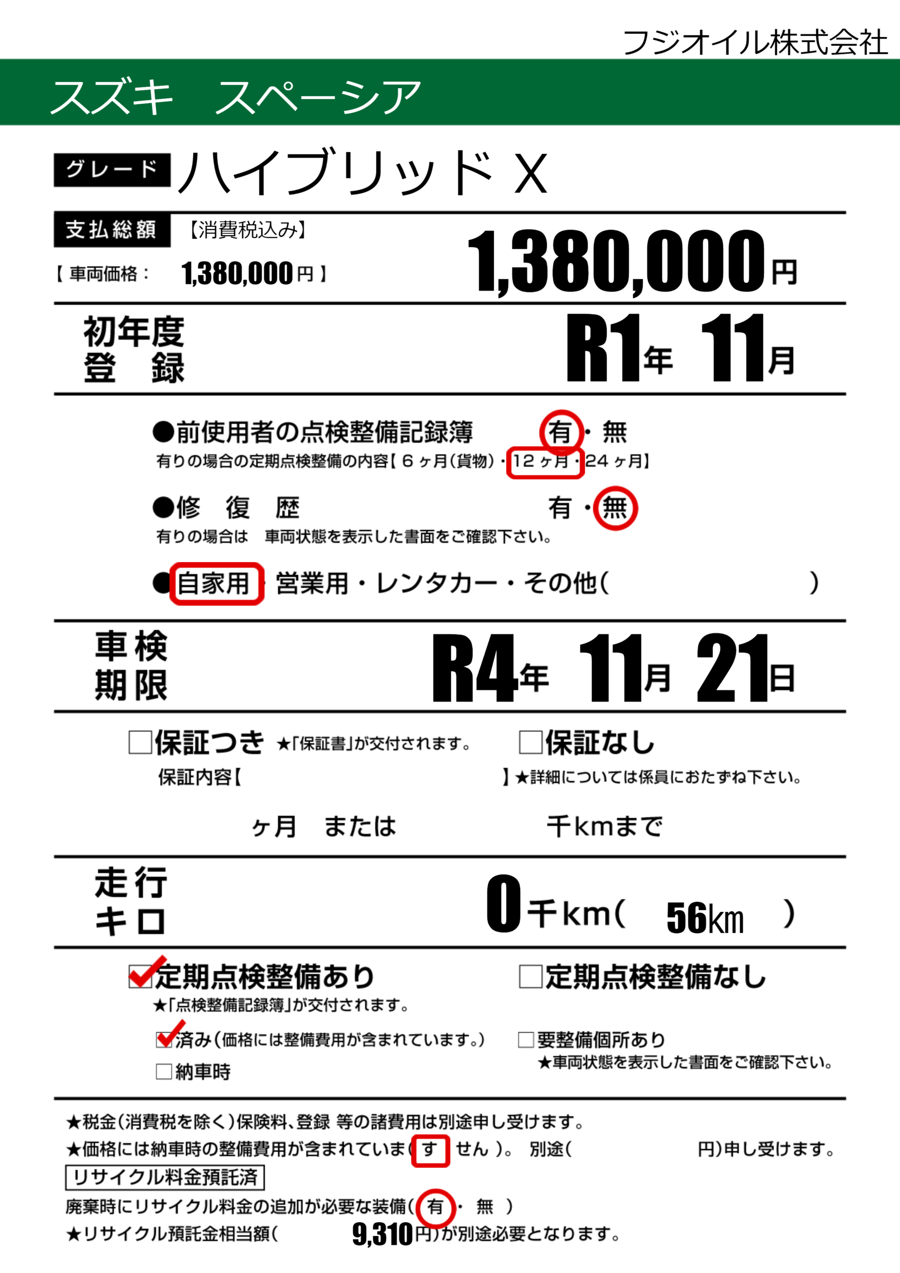 | 定期点検整備 | 定期点検整備あり 定期点検整備済み | ||